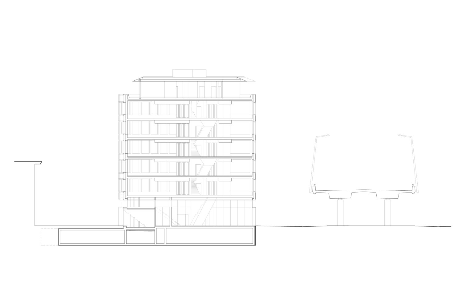 Äusserlich macht das Gebäude mit einer subtilen Prägnanz auf sich aufmerksam. Blickfang sind die in den Strassenraum ausgedrehten Stirnfassaden und ein mit einer Glashaut eingekleidetes Erdgeschoss. Diese unterstreichen den Öffentlichkeitscharakter des Gebäudes und verankern Allreal maximal im Strassenraum. Hinter der Glashaut liegt ein Foyer, das durch einen Showroom und ein Auditorium ergänzt wird.