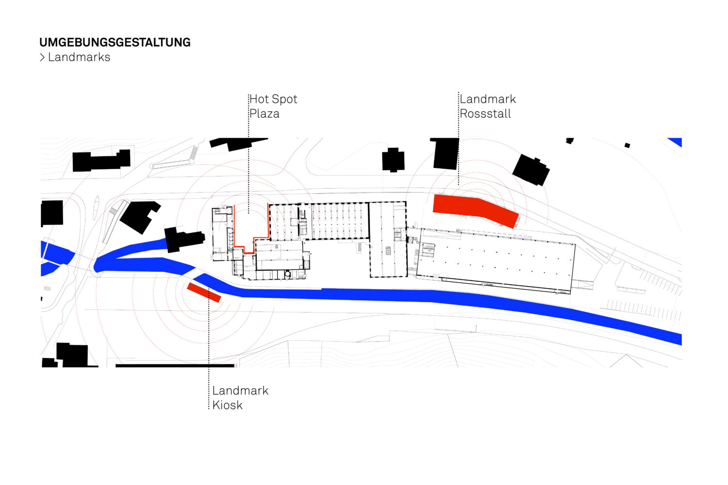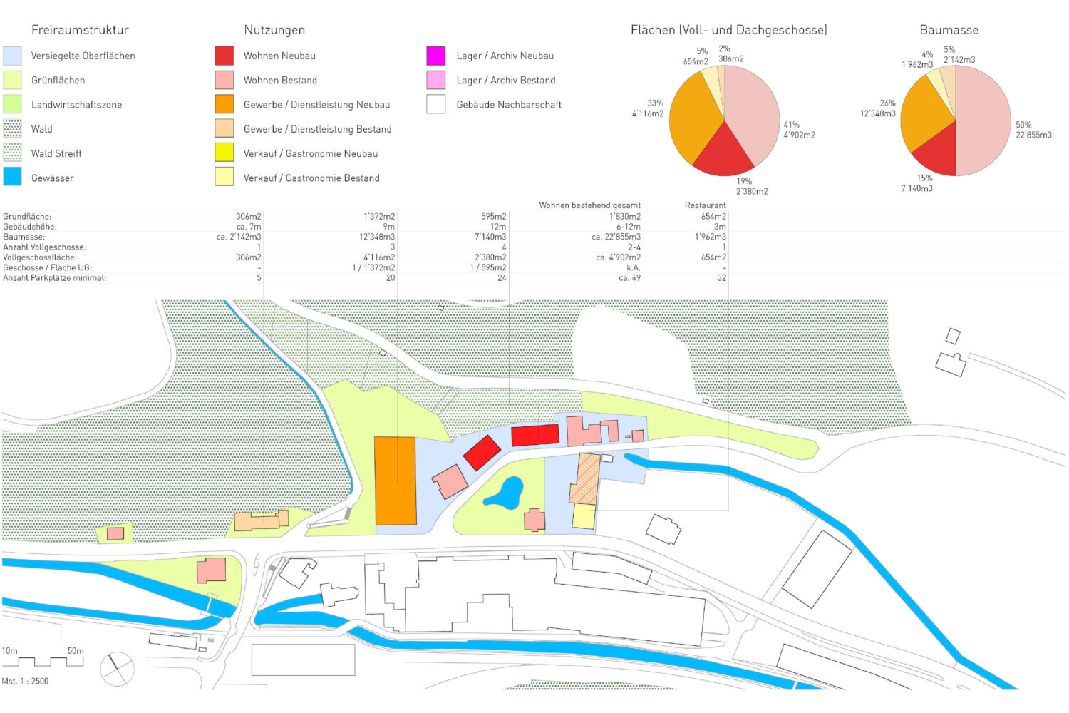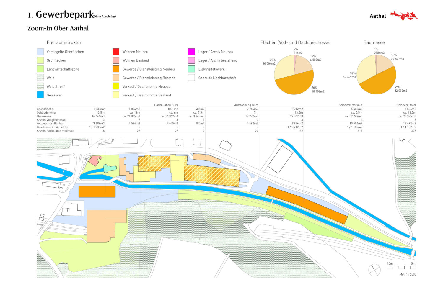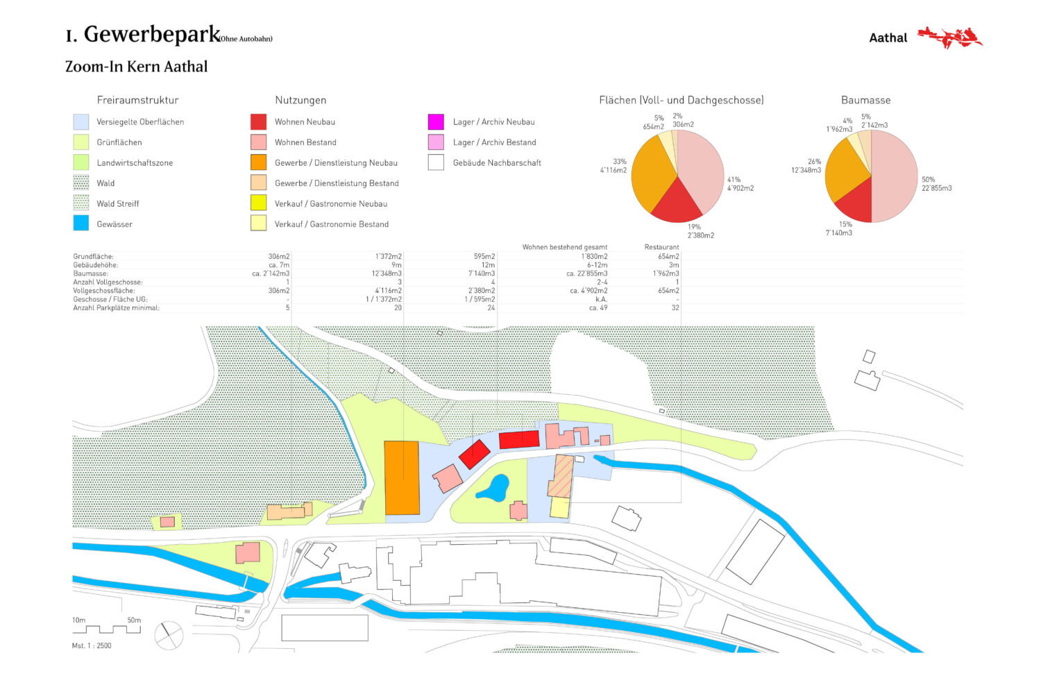 Daraufhin erfolgte eine Testplanung, in der das bestehende Immobilienportfolio hinsichtlich Bestandssituation und Standortpotenzial sowie Rahmenbedingungen und Nutzungspotenzial analysiert wurde. Auf dieser Grundlage konnten vier Entwicklungsszenarien sowie der Marktwert des Portfolios erarbeitet werden. Sie bildeten die Basis für die strategische Neuausrichtung: ein zukunftsfähiges Aathal mit vielfältigen Nutzungsangeboten wie Gastronomie, Verkauf, Gewerbe und Dienstleistungen.