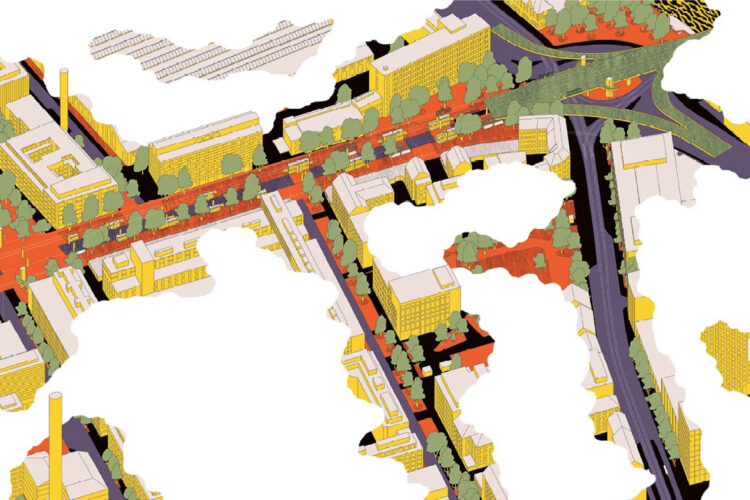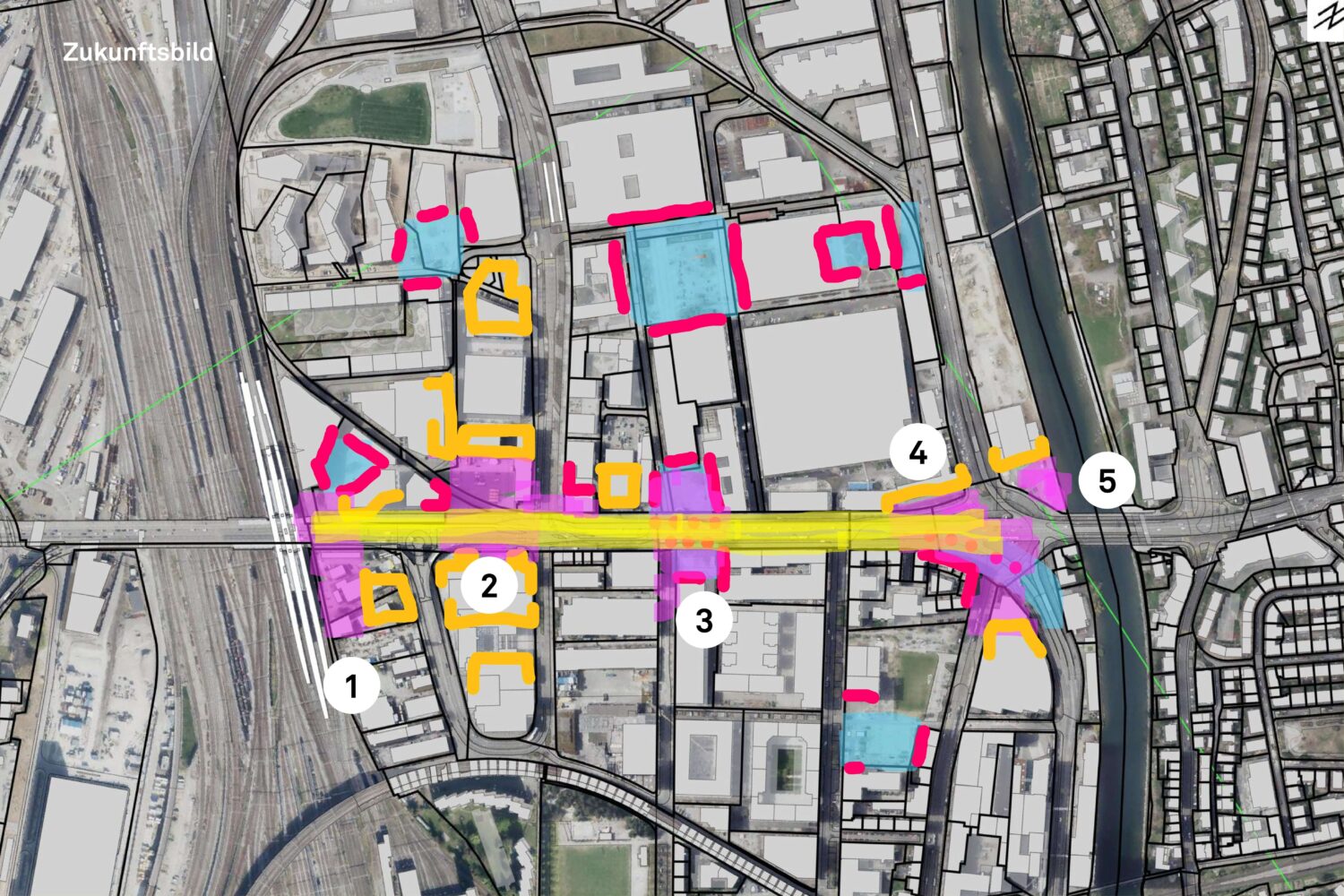 Belebte Erdgeschosse: Die angrenzenden Liegenschaften, ob private oder öffentliche, werden mit dem Raum unter der Brücke verknüpft.