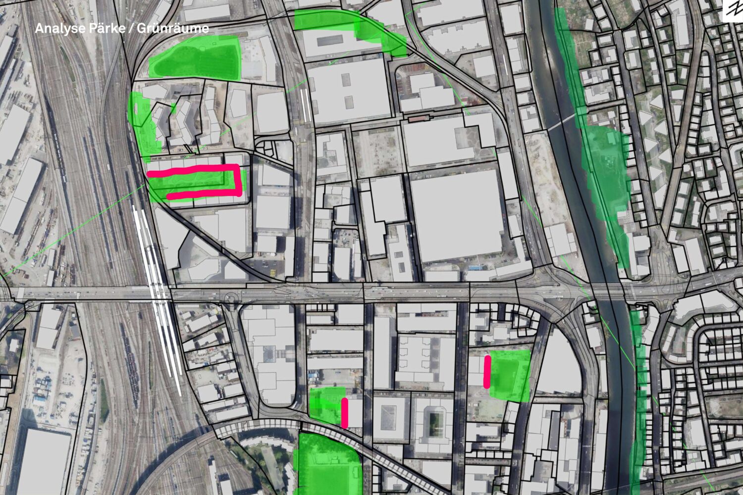 Konzentriertes, starkes Grün: Trotz schwieriger Bedingungen wird der Raum intensiv begrünt und wo möglich entsiegelt, inklusive Begrünungselementen an der Brückenkonstruktion.