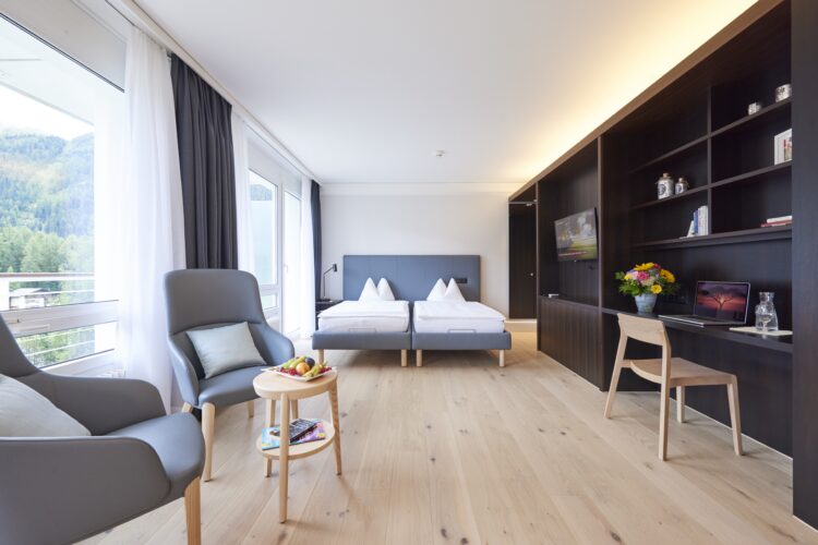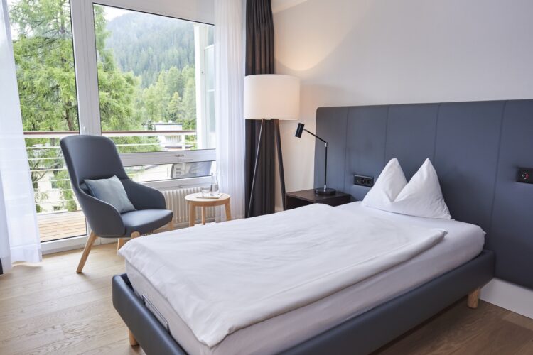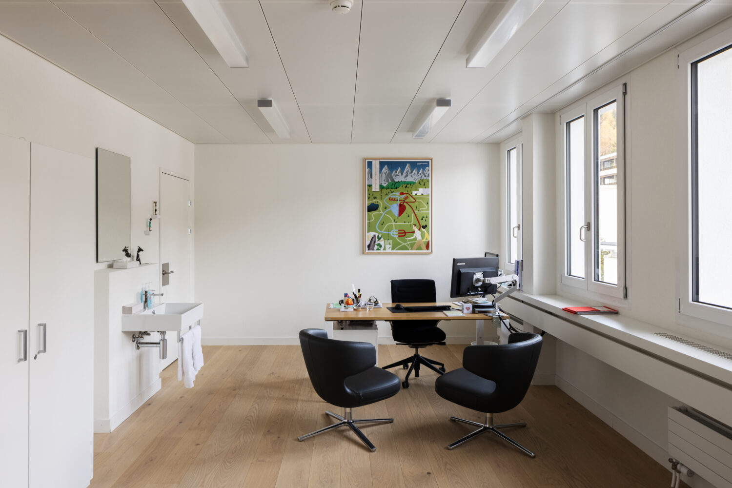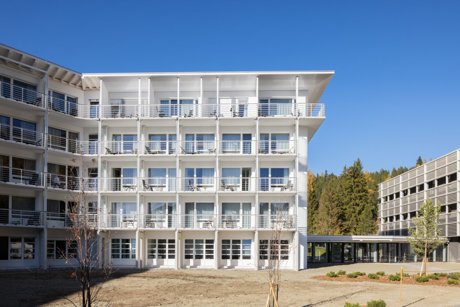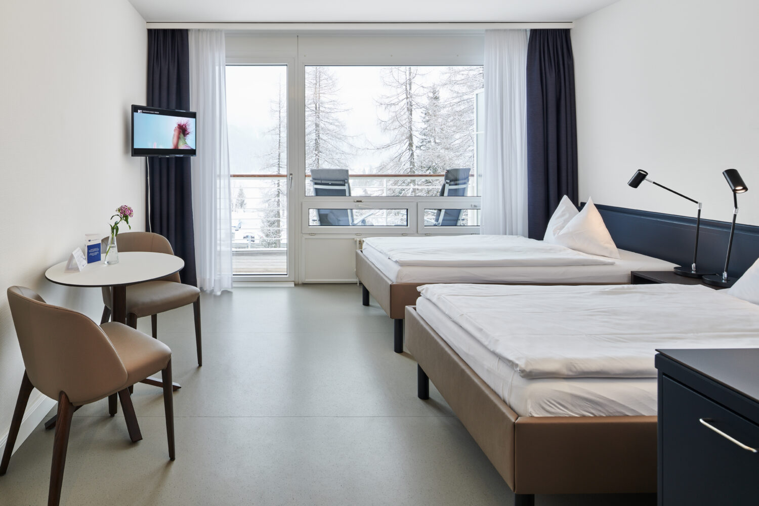 Die neuen, grosszügigeren Zimmertypen der Aufstockung fügen sich in das Konzept der «First-Class Reha-Hospitality» ein, während die unteren Geschosse in einem tieferen Standard ausgebaut wurden. Privat-, Halbprivat- und Allgemeinzimmer decken so die Bedürfnisse und Ansprüche der Zielgruppen der alpinen Klinik ab.
