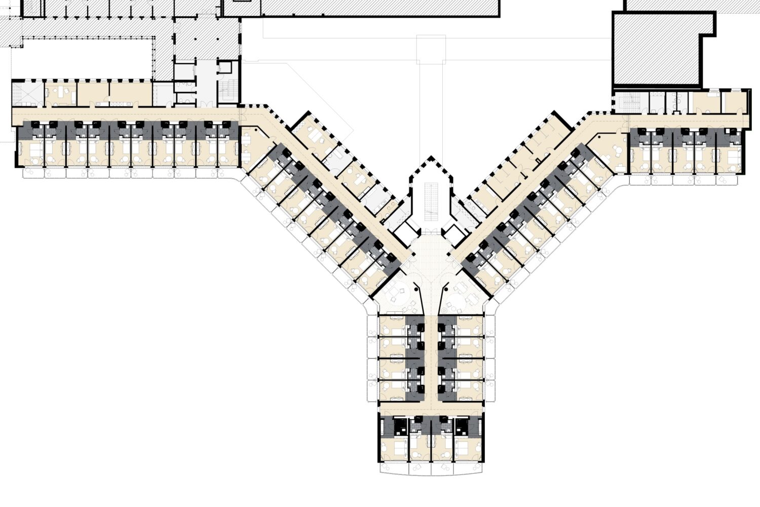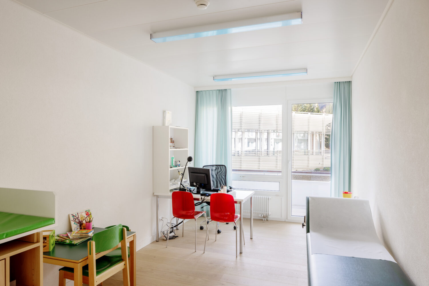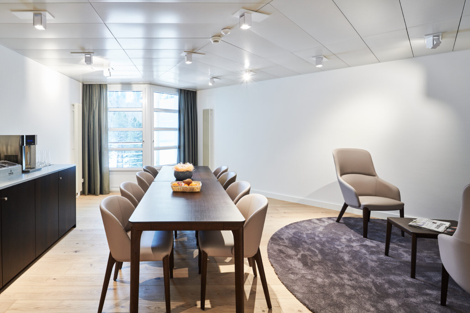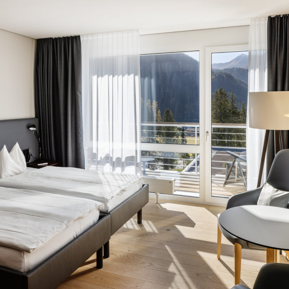 Die neuen, grosszügigeren Zimmertypen der Aufstockung fügen sich in das Konzept der «First-Class Reha-Hospitality» ein, während die unteren Geschosse in einem tieferen Standard ausgebaut wurden. Privat-, Halbprivat- und Allgemeinzimmer decken so die Bedürfnisse und Ansprüche der Zielgruppen der alpinen Klinik ab.