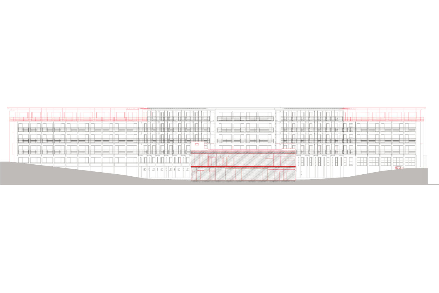 Architektonisch lehnt sich die Aufstockung dem bestehenden Ausdruck des Gebäudes an, ohne den Bestand eins zu eins weiterzubauen. Durch die Vergrösserung der Zimmerraster der Aufstockung entsteht für die Fassade eine spannungsvolle Ergänzung, die den neuen Auftritt der Klinik unterstreicht.