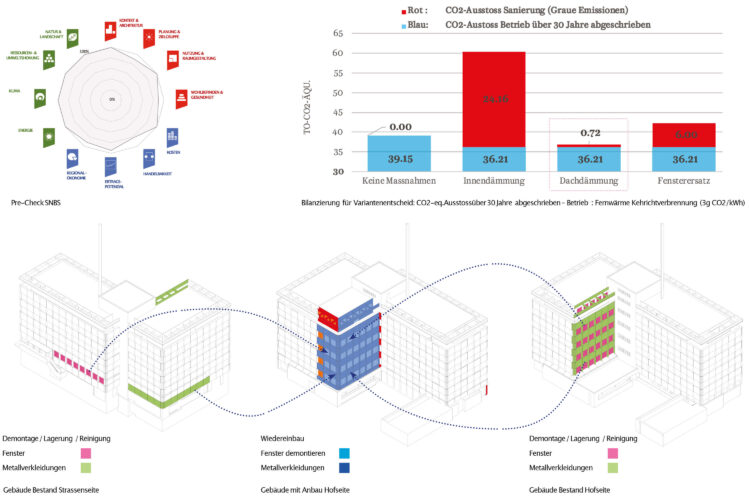 Neue Materialien wurden soweit möglich vermeiden und zugleich bestehende Materialen und Bauteile konsequent wiederverwendet. So soll die Fassade nur wo nötig ertüchtig werden. Die Elemente der Fassadenverkleidung, welche durch Anpassungen entfallen, werden für den Anbau genutzt. Auch neue Gebäudetechnik wurde aktiv vermieden, so wird passiv über die Gebäudemasse gekühlt. Für die Erweiterung wurde eine Holzkonstruktion mit einer Hanfbetondämmung kombiniert.