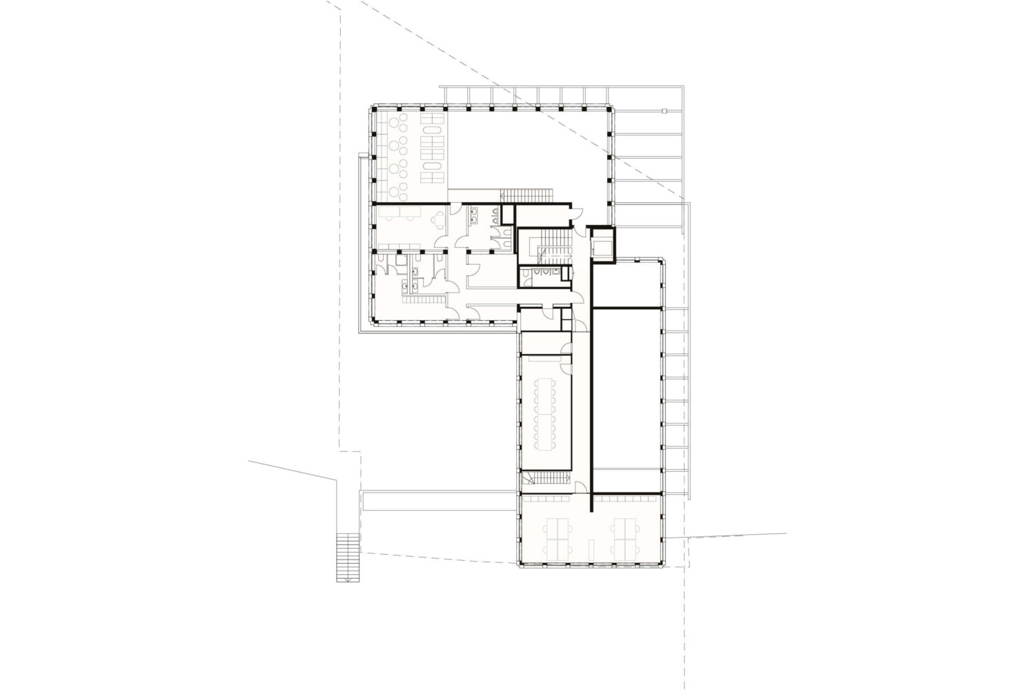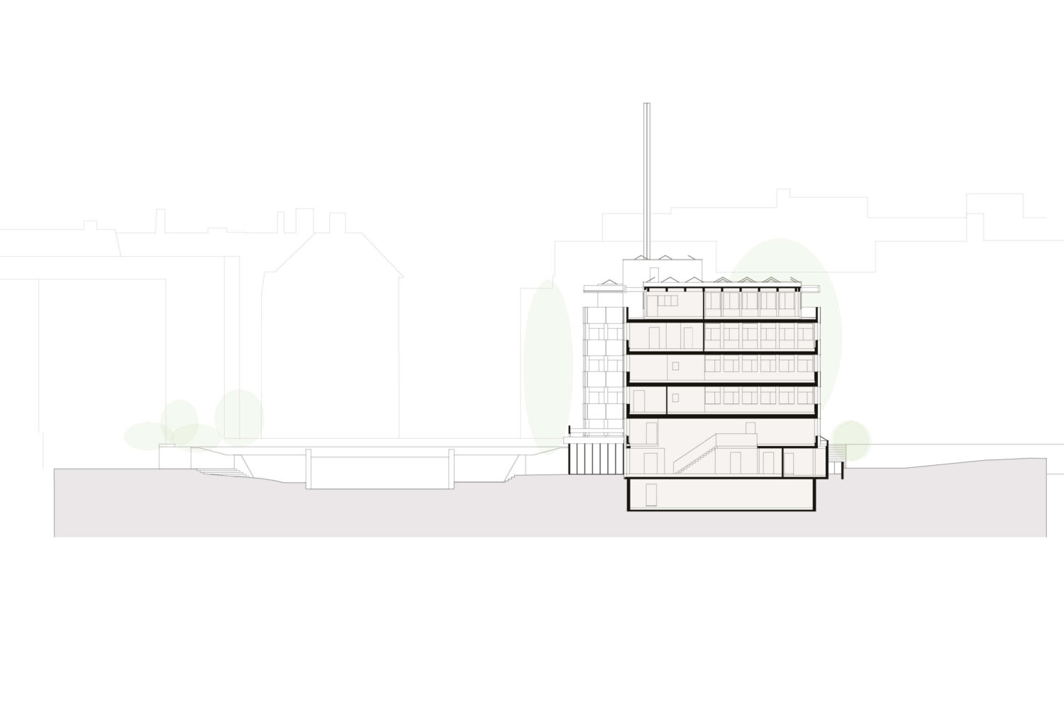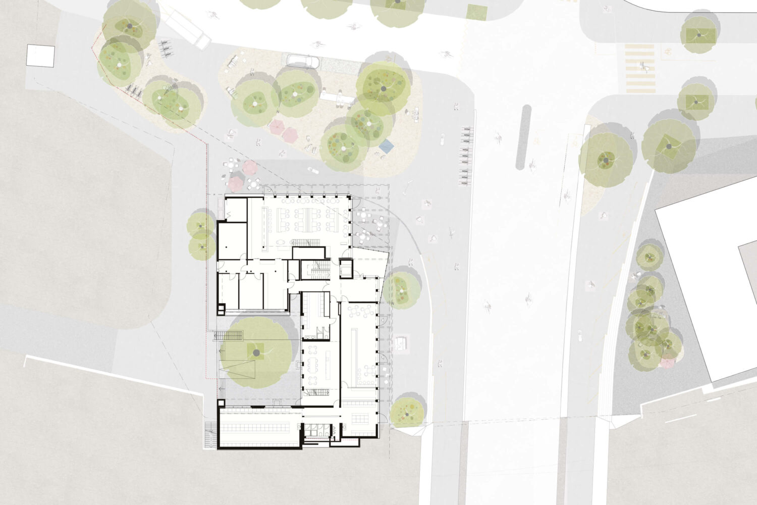 Um die grauen Emissionen so gering wie möglich zu halten, wurde auf eine für die Raumorganisation im ersten Moment logische Erweiterung des Kellergeschosses verzichtet. Damit kann auch die Platane erhalten werden, die direkt am Gleisfeld Qualitäten erhält – visuell, für den Aufenthalt aber auch zur Hitzeminderung.