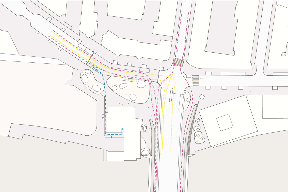 Der Projektvorschlag schlägt zusätzlich eine Änderung des Verkehrsregimes vor, um die beengte und für den Aufenthalt unattraktive Situation um die nordöstliche Gebäudeecke zu lösen. Indem in der Röntgenstrasse eine 20er-Begegnungszone geschaffen wird, können Fussgänger und Velofahrer entflochten werden.