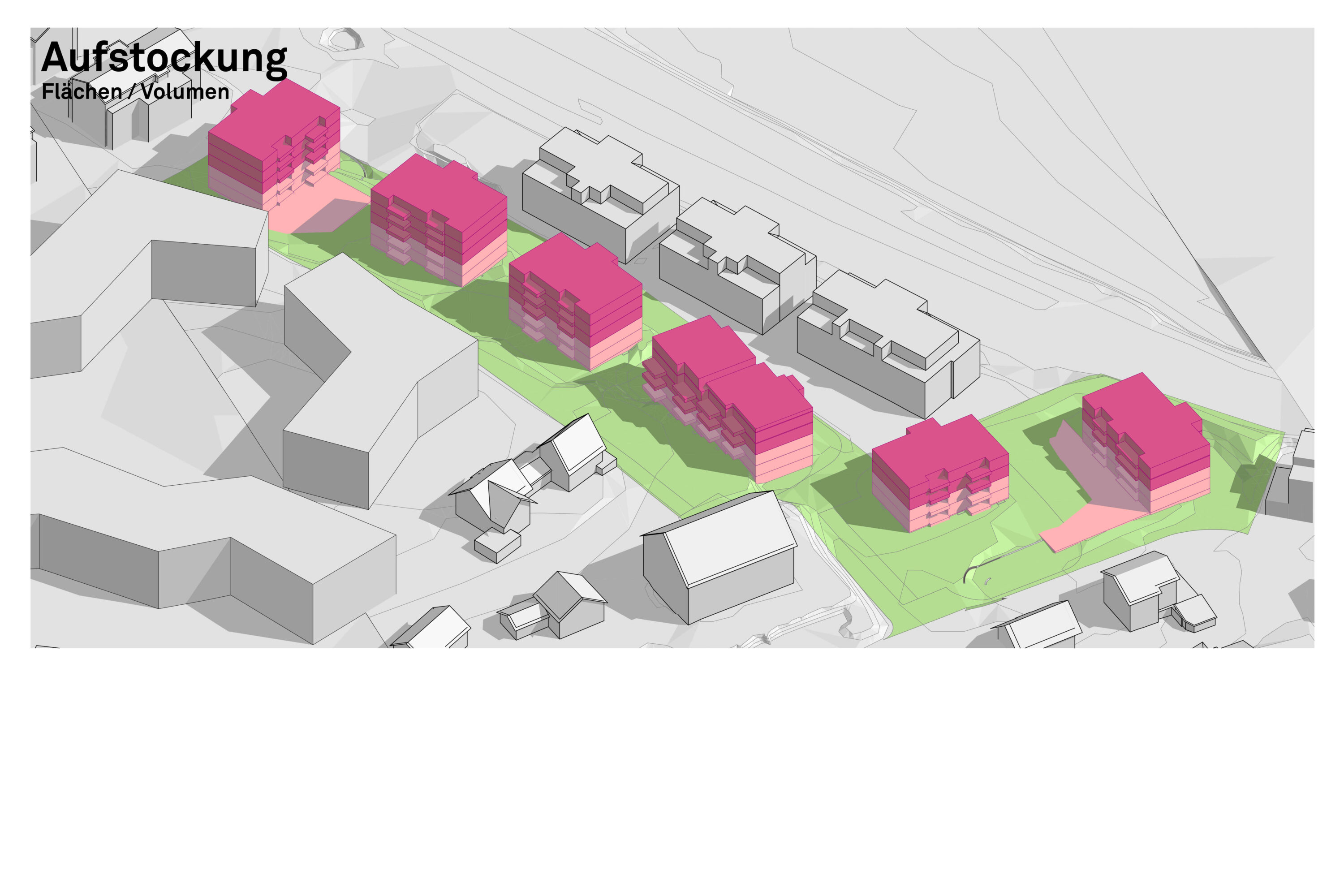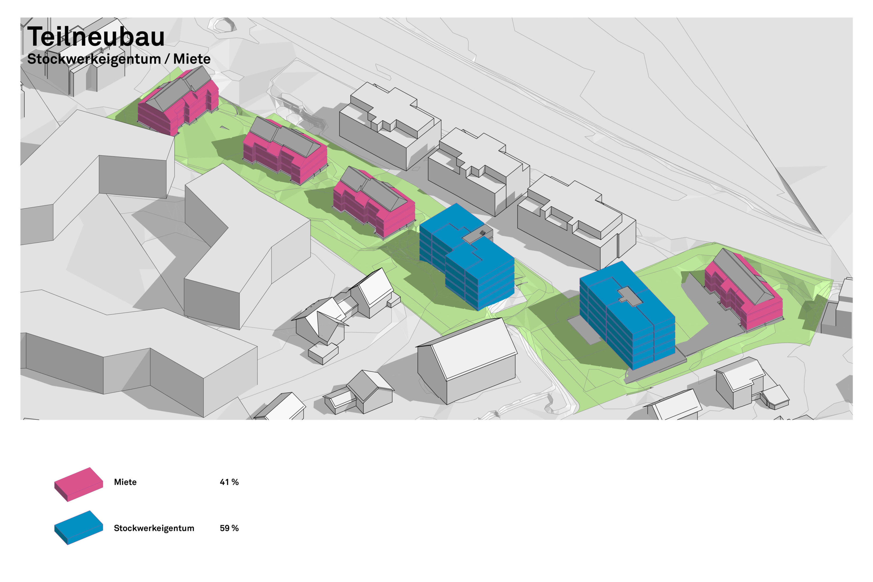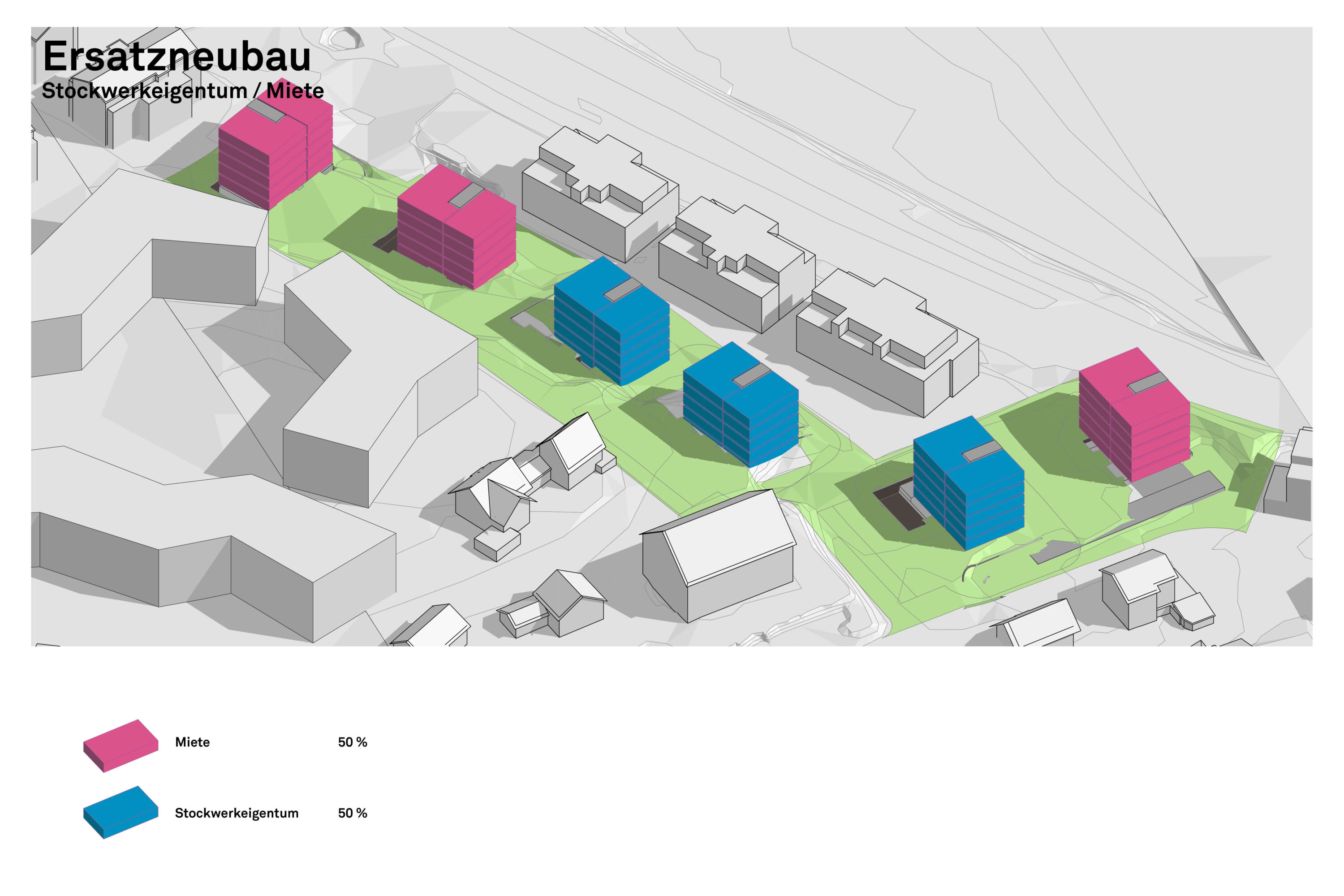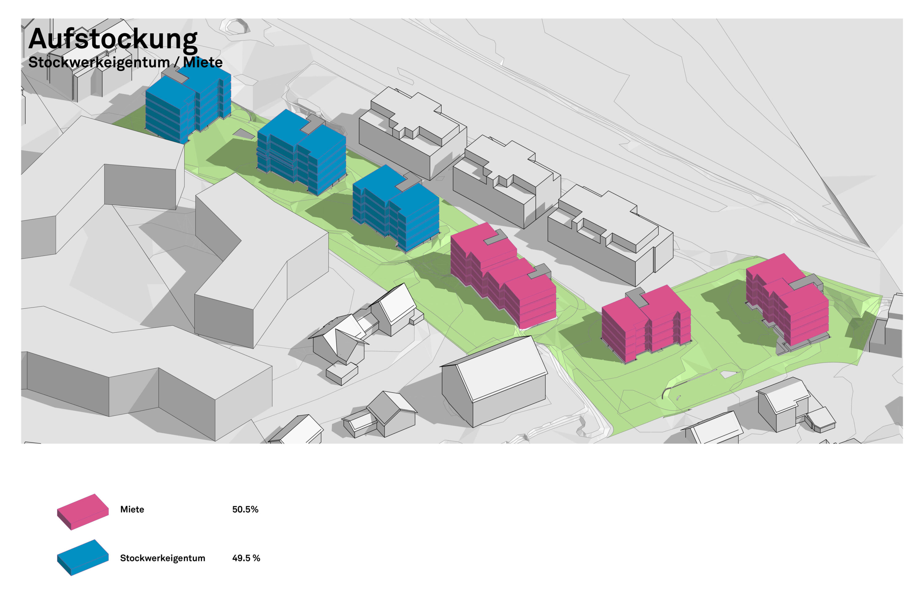 Nach den aktuellen baurechtlichen Vorgaben besteht das Potenzial, auf den bestehenden Parzellen zusätzliche anrechenbare Geschossfläche zu realisieren. Im Rahmen einer Machbarkeitsstudie sollen verschiedene Entwicklungsvarianten geprüft werden. Ziel ist eine ausgewogene Neustrukturierung mit einem Anteil von rund 55 % Stockwerkeigentum und 45 % Mietwohnungen.