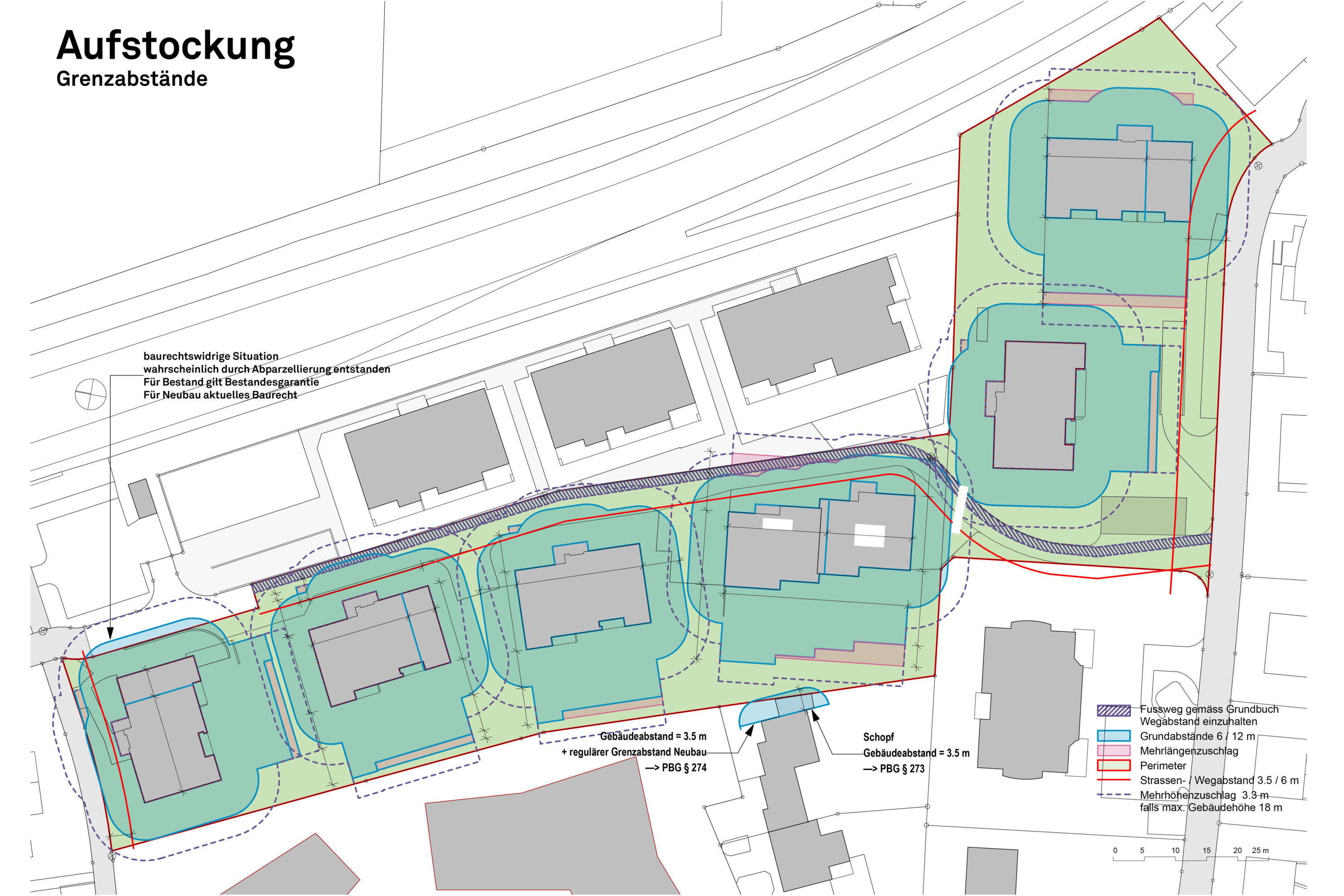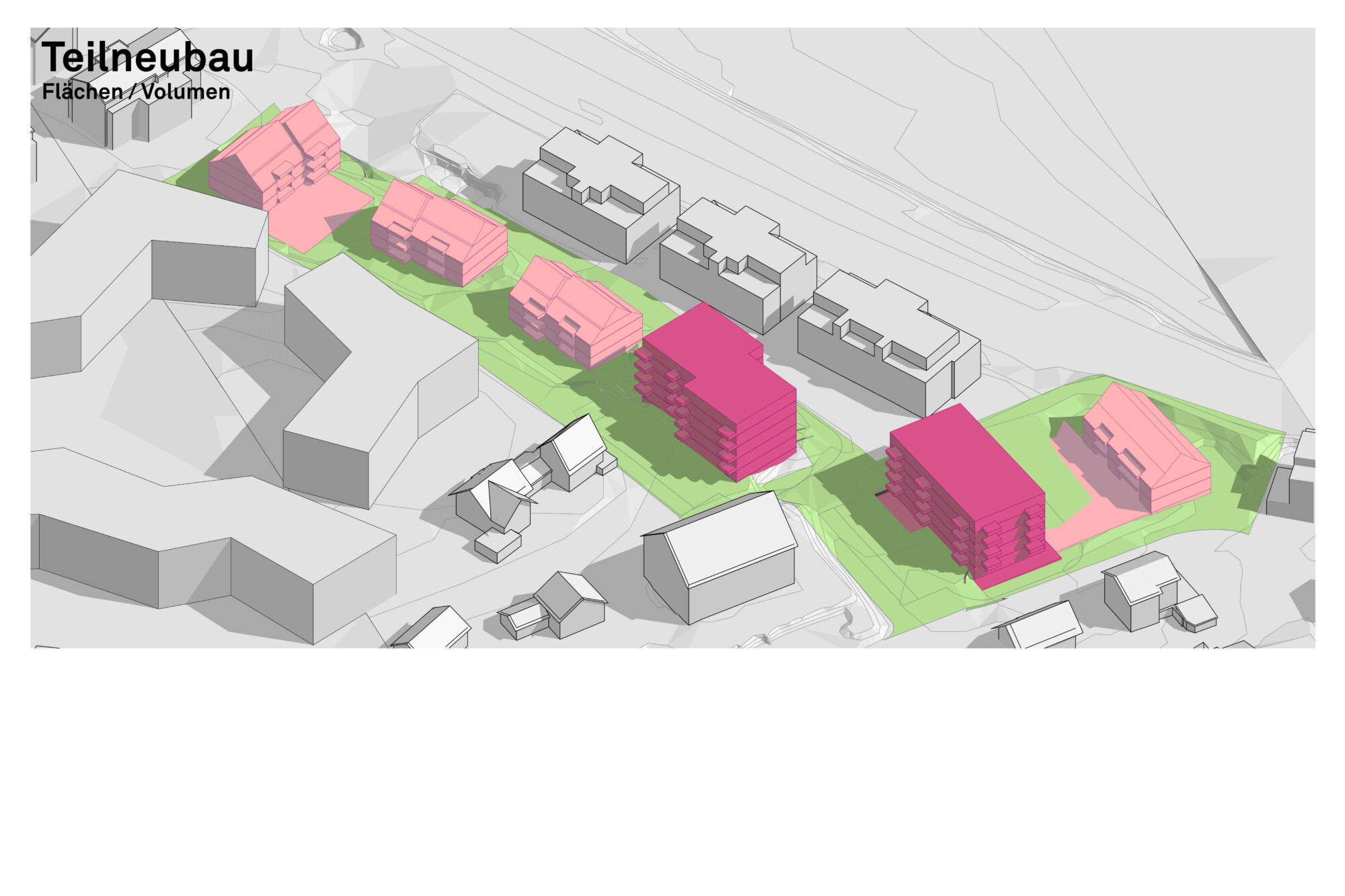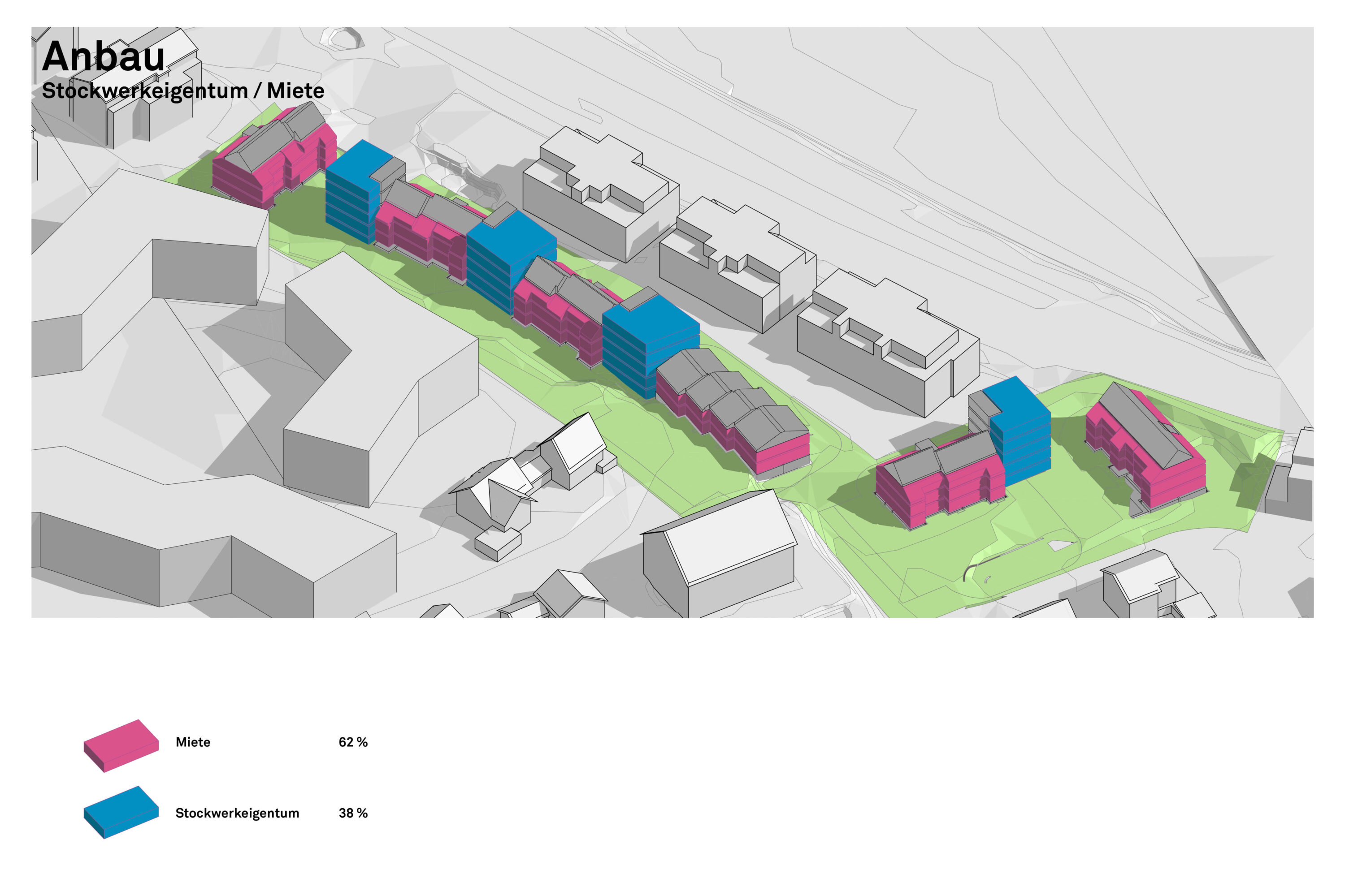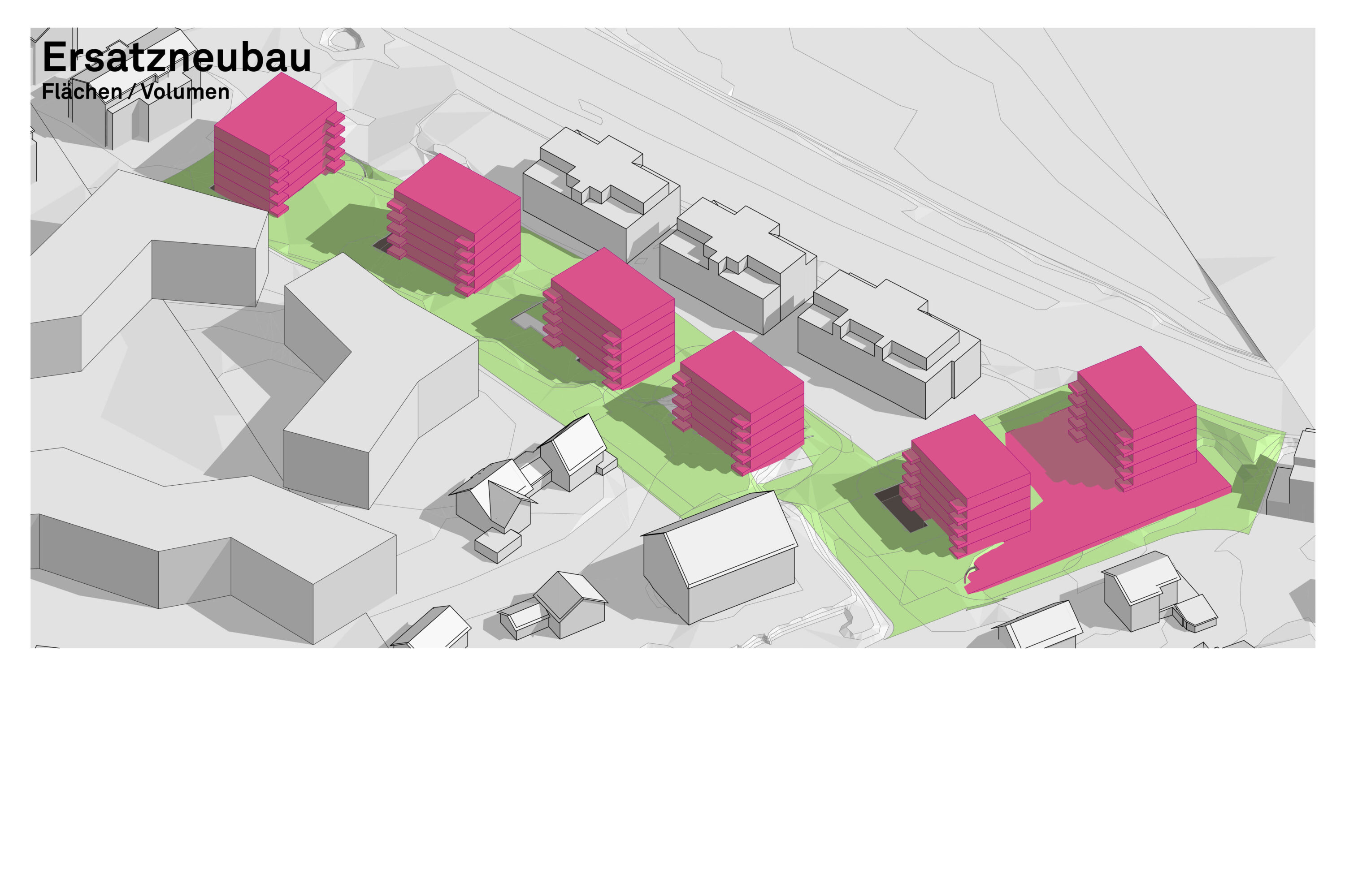 Nach den aktuellen baurechtlichen Vorgaben besteht das Potenzial, auf den bestehenden Parzellen zusätzliche anrechenbare Geschossfläche zu realisieren. Im Rahmen einer Machbarkeitsstudie sollen verschiedene Entwicklungsvarianten geprüft werden. Ziel ist eine ausgewogene Neustrukturierung mit einem Anteil von rund 55 % Stockwerkeigentum und 45 % Mietwohnungen.