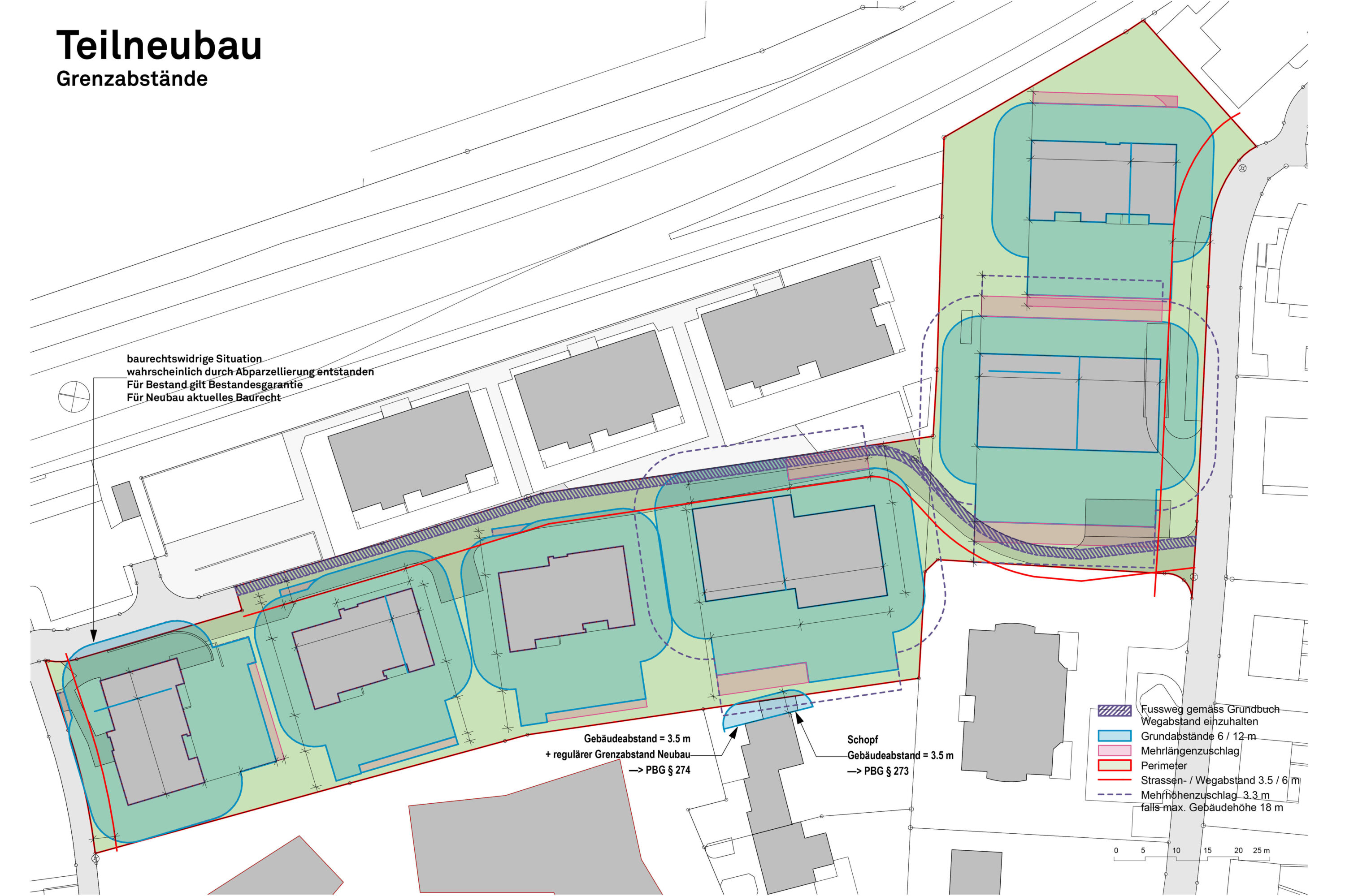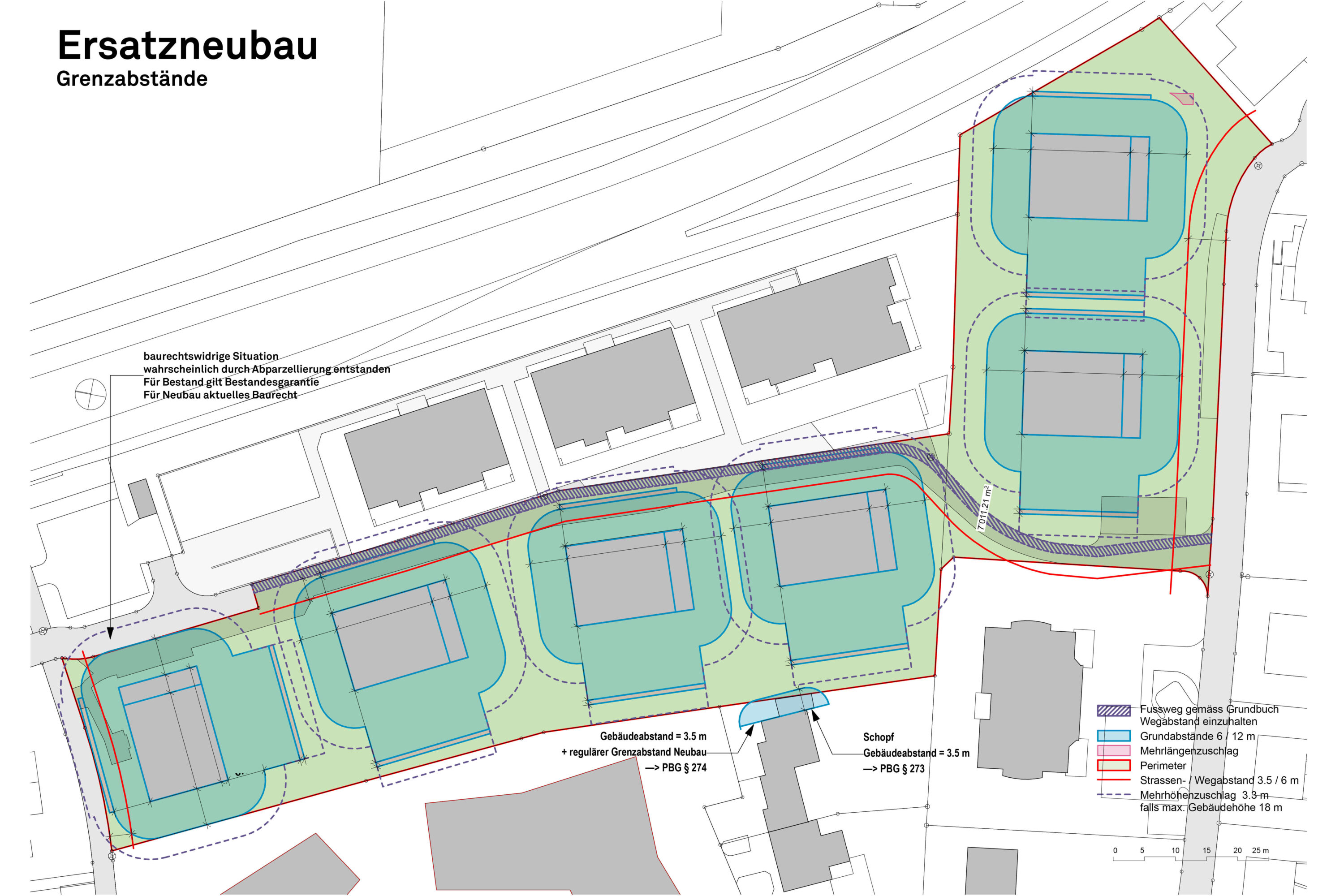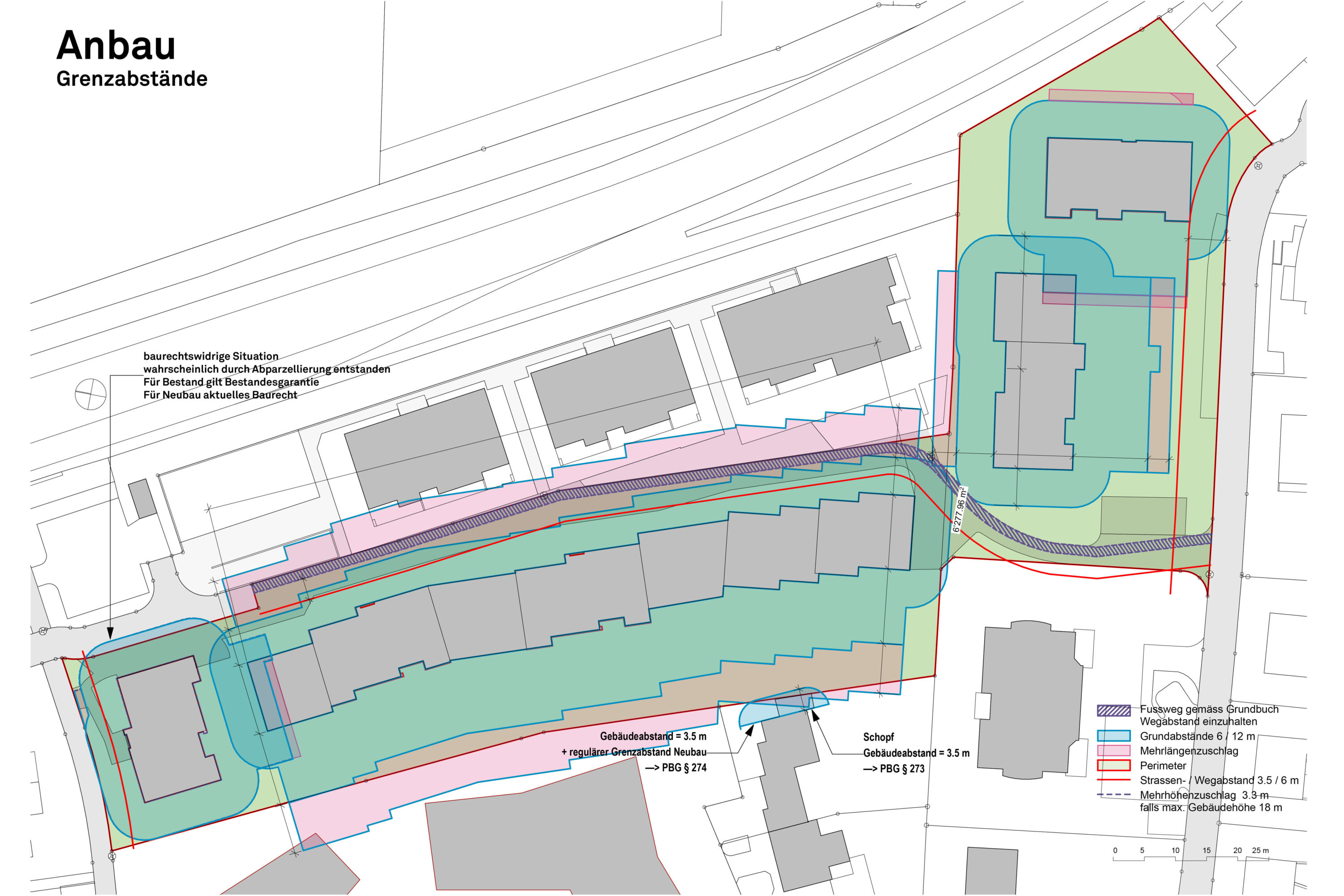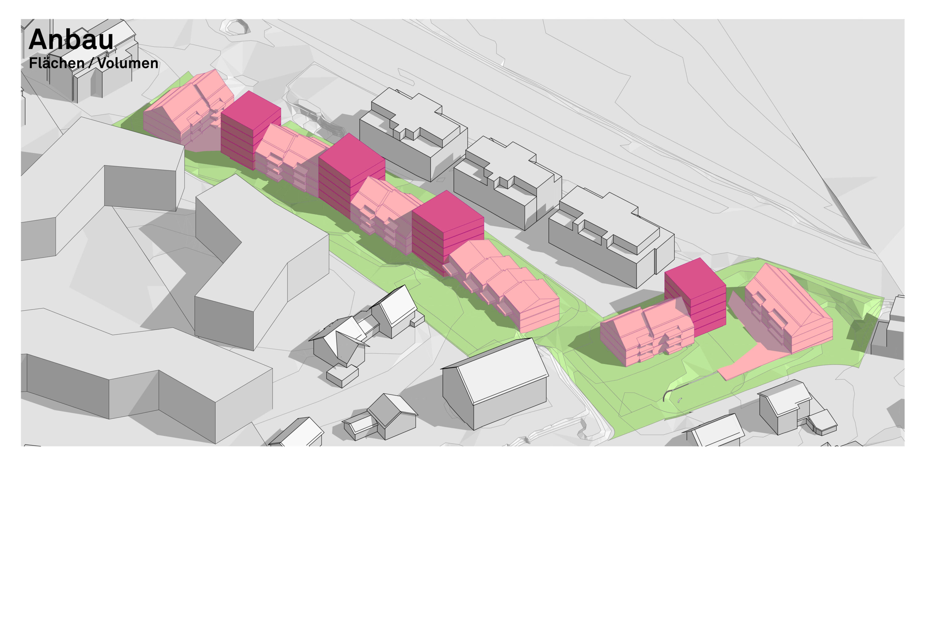 Nach den aktuellen baurechtlichen Vorgaben besteht das Potenzial, auf den bestehenden Parzellen zusätzliche anrechenbare Geschossfläche zu realisieren. Im Rahmen einer Machbarkeitsstudie sollen verschiedene Entwicklungsvarianten geprüft werden. Ziel ist eine ausgewogene Neustrukturierung mit einem Anteil von rund 55 % Stockwerkeigentum und 45 % Mietwohnungen.