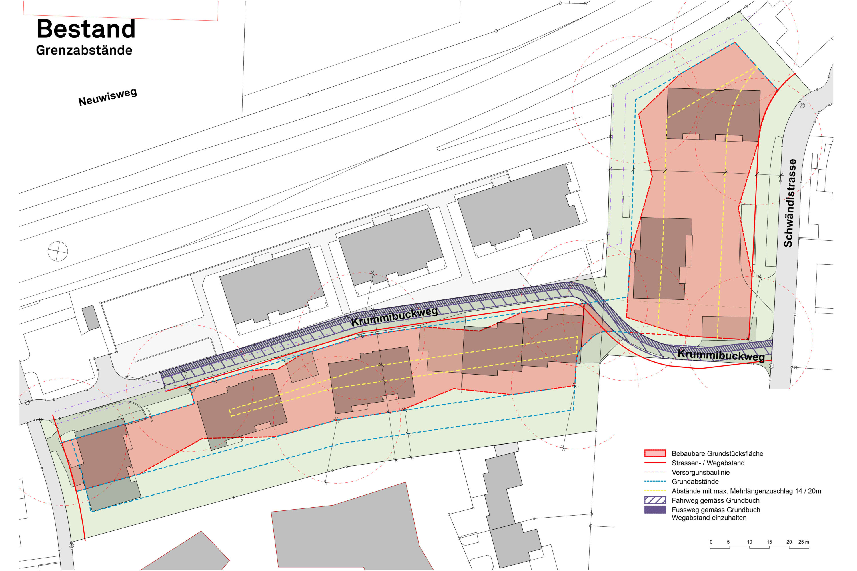 Die Überbauung am Krummibuckweg 2–12 und an der Schwändistrasse 5 besteht aus sechs Wohnliegenschaften, erbaut zwischen 1960 und 1985. Die Gebäude weisen einen einfachen, neutralen Ausbaustandard auf. In der Vergangenheit wurden verschiedene Sanierungsmassnahmen durchgeführt, sodass sich die Bauten heute in einem insgesamt guten baulichen Zustand befinden.