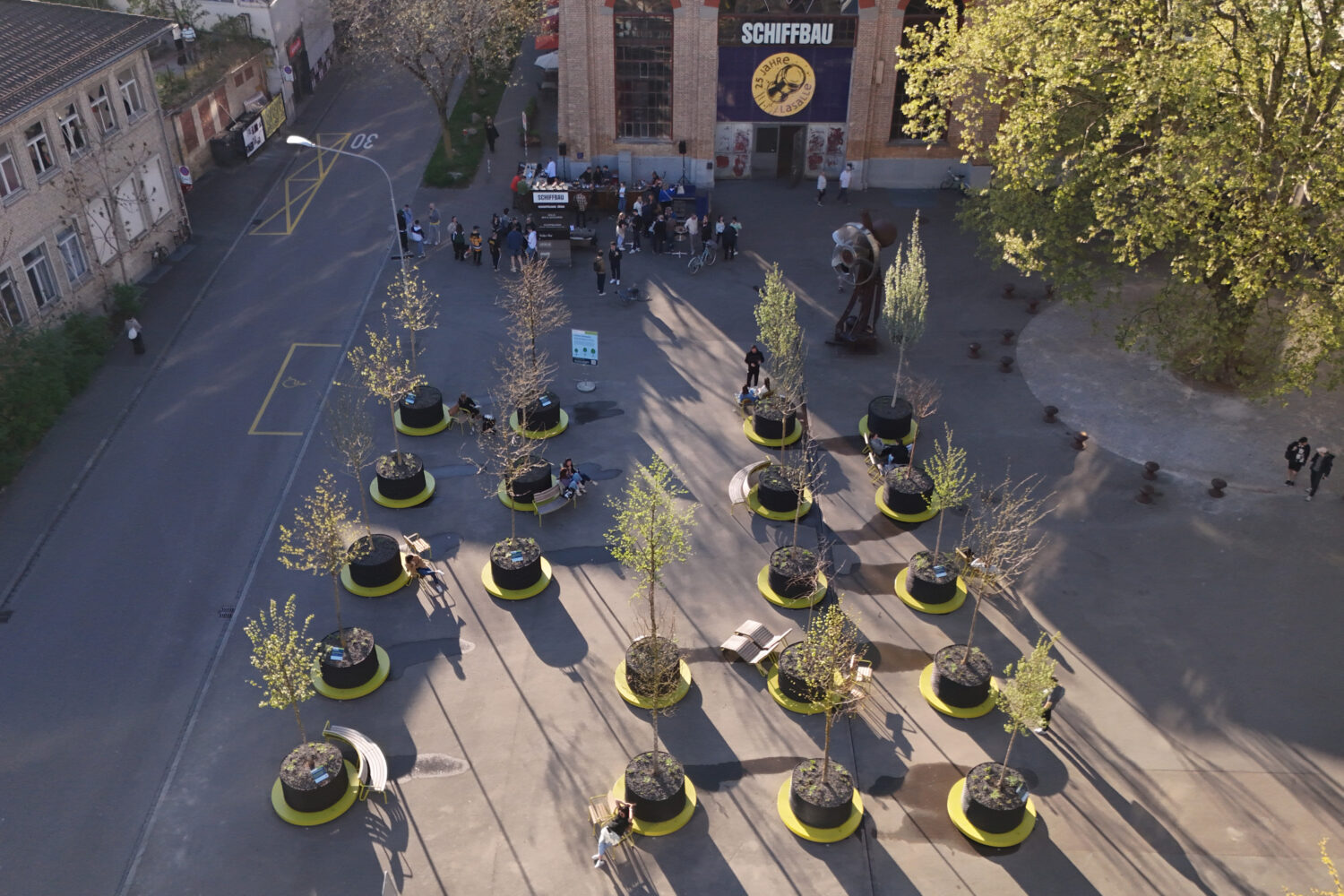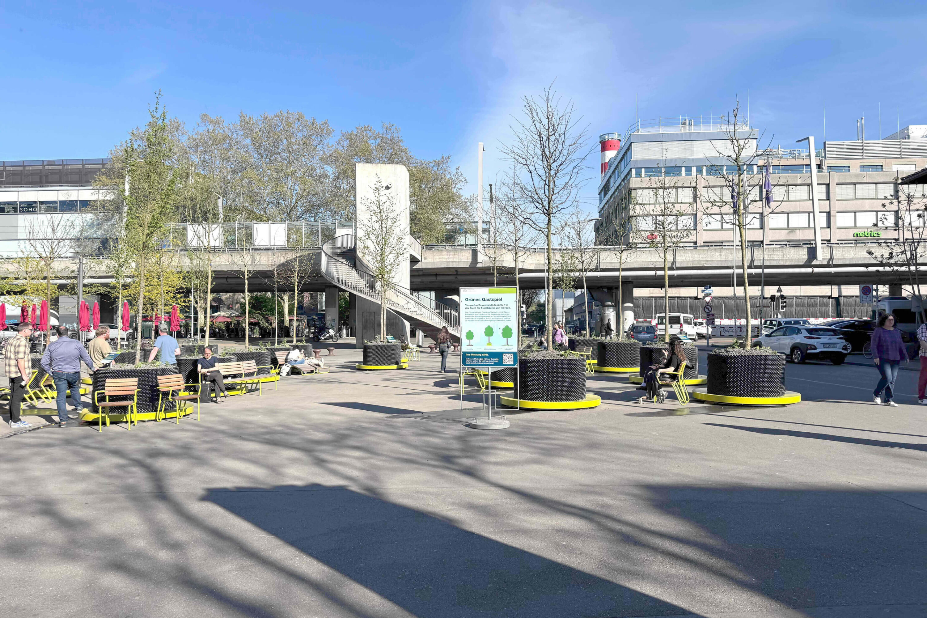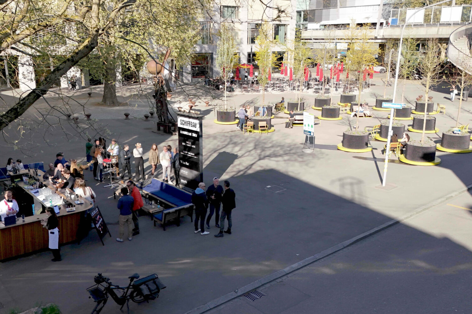 Letzten Freitag  hat sich der Schiffbauplatz und die Tramhaltestelle Schiffbau sichtbar verändert: Aus einer grauen Fläche ist mit einer Baumschule aus 32 Bäumen ein lebendiger, begrünter Stadtraum entstanden – ein Ort zum Verweilen, Begegnen und Durchatmen.