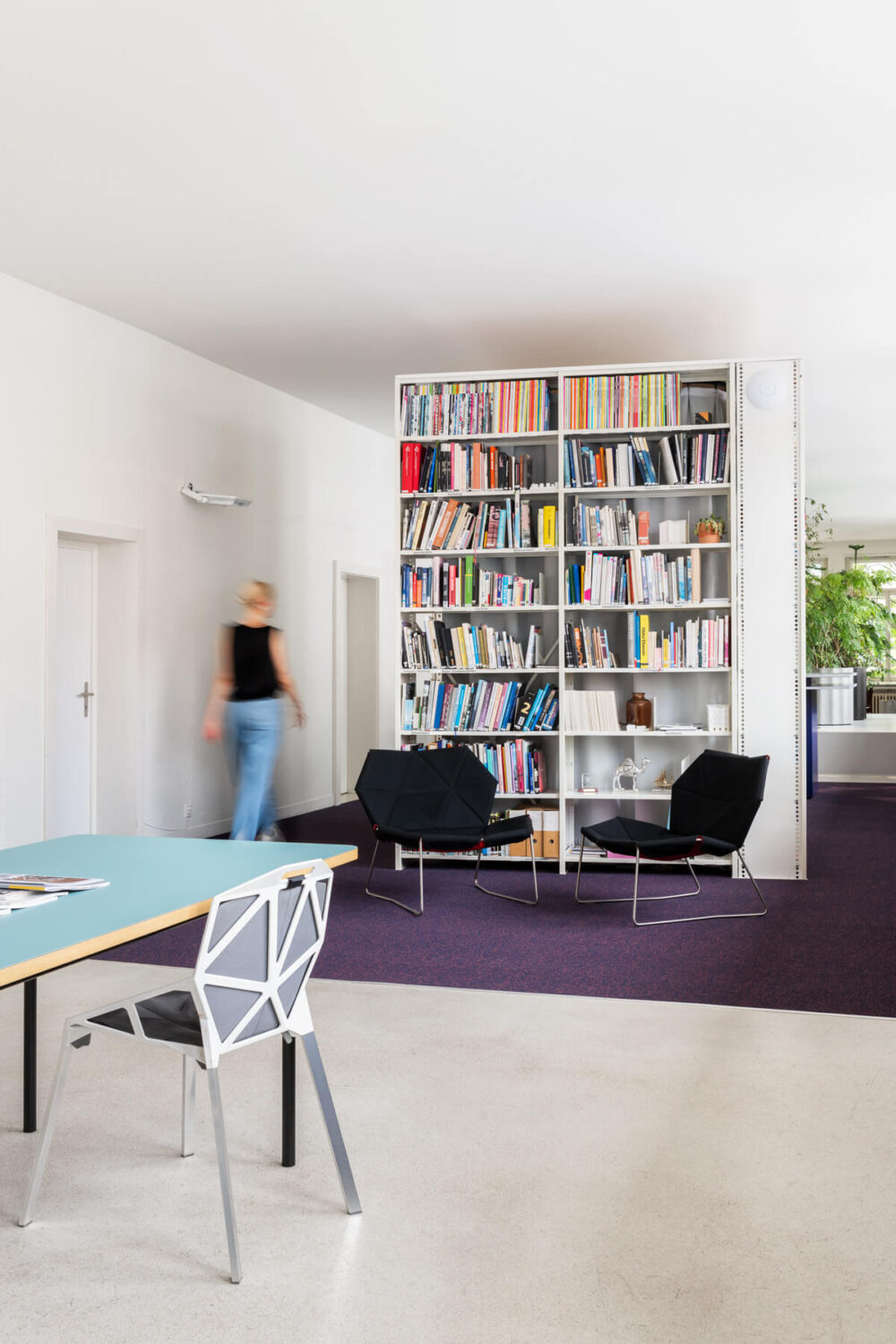 The aim was to reuse as much as possible. Our old desks were turned into a platform for our office forest and individual workstations, and our shelves were turned into a library with an integrated meeting zone.