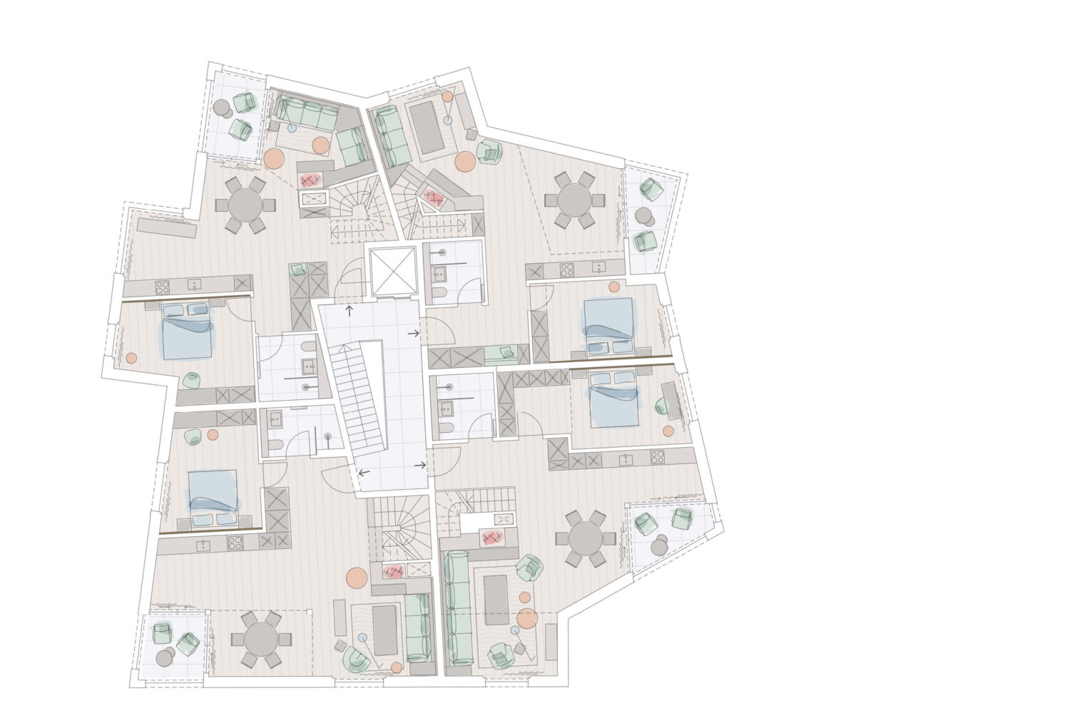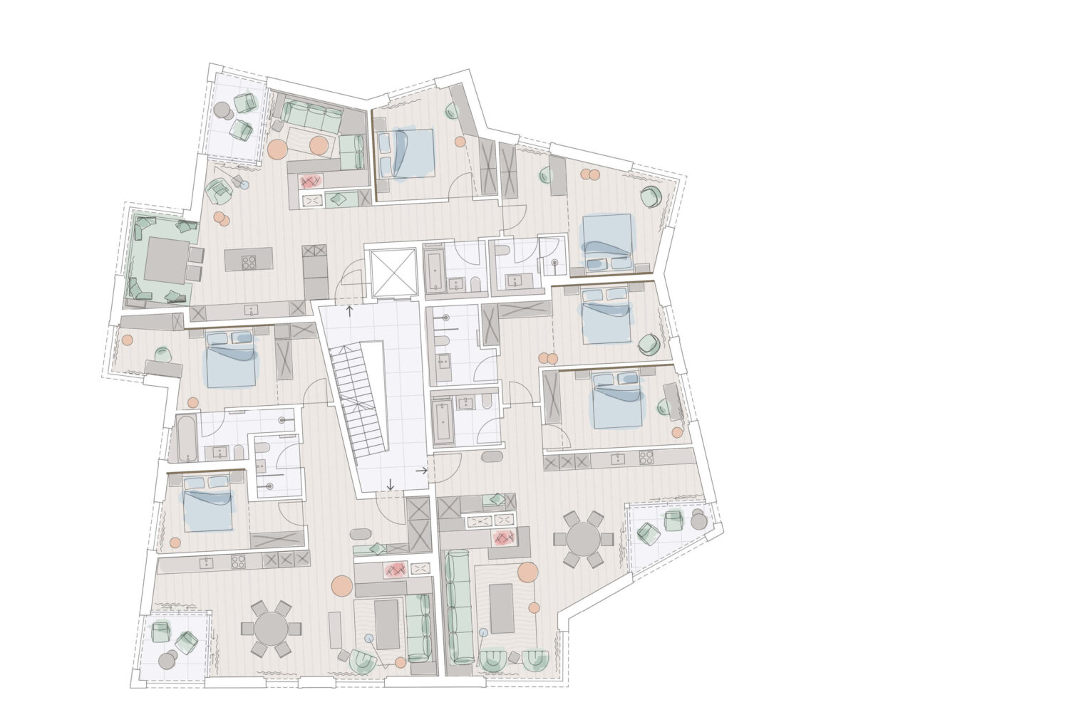The apartment building pays homage to the traditional Heimatstil, which draws on rural and regional architectural forms. This is complemented by modern elements and light-flooded rooms.