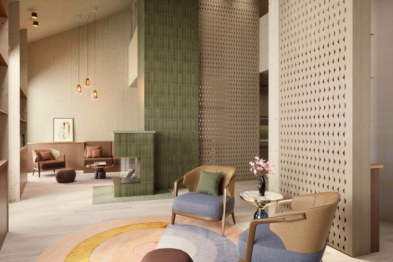 Abstract sgraffito patterns, used on the exterior, create a link between local tradition and modernity. The clear materiality of the timber construction runs consistently through the entire building.