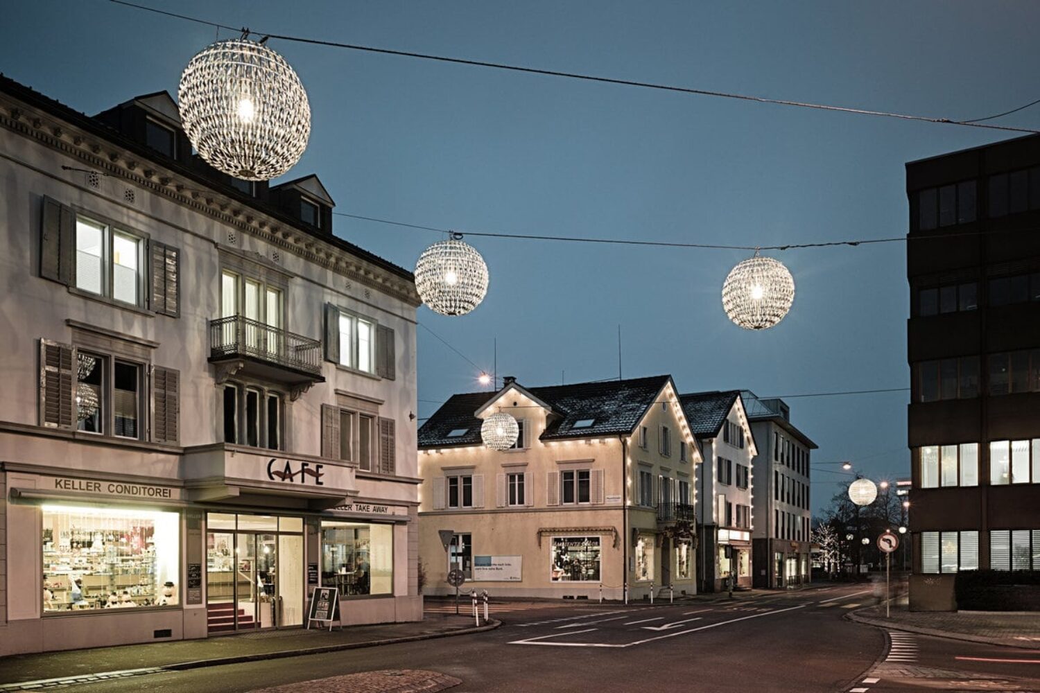 Spherical lighting elements of various sizes are being suspended into the skyline above the streets of the centre of Uster. At six different locations, these luminaires form known constellations, which can actually be observed in the December sky above Uster.