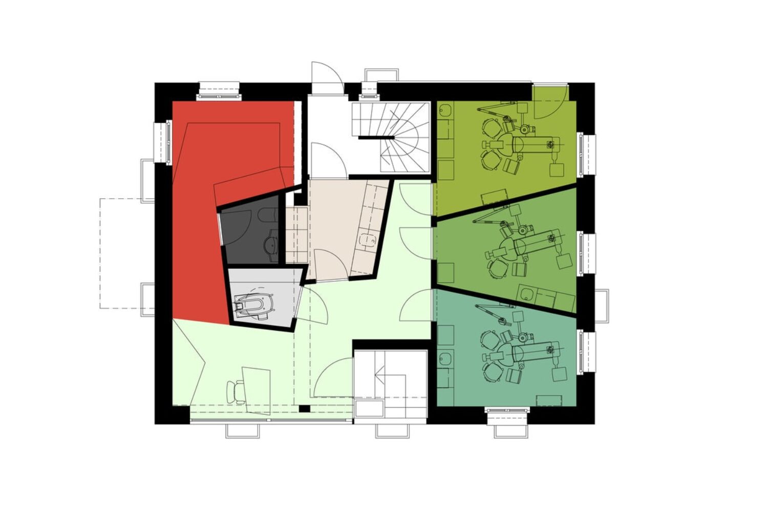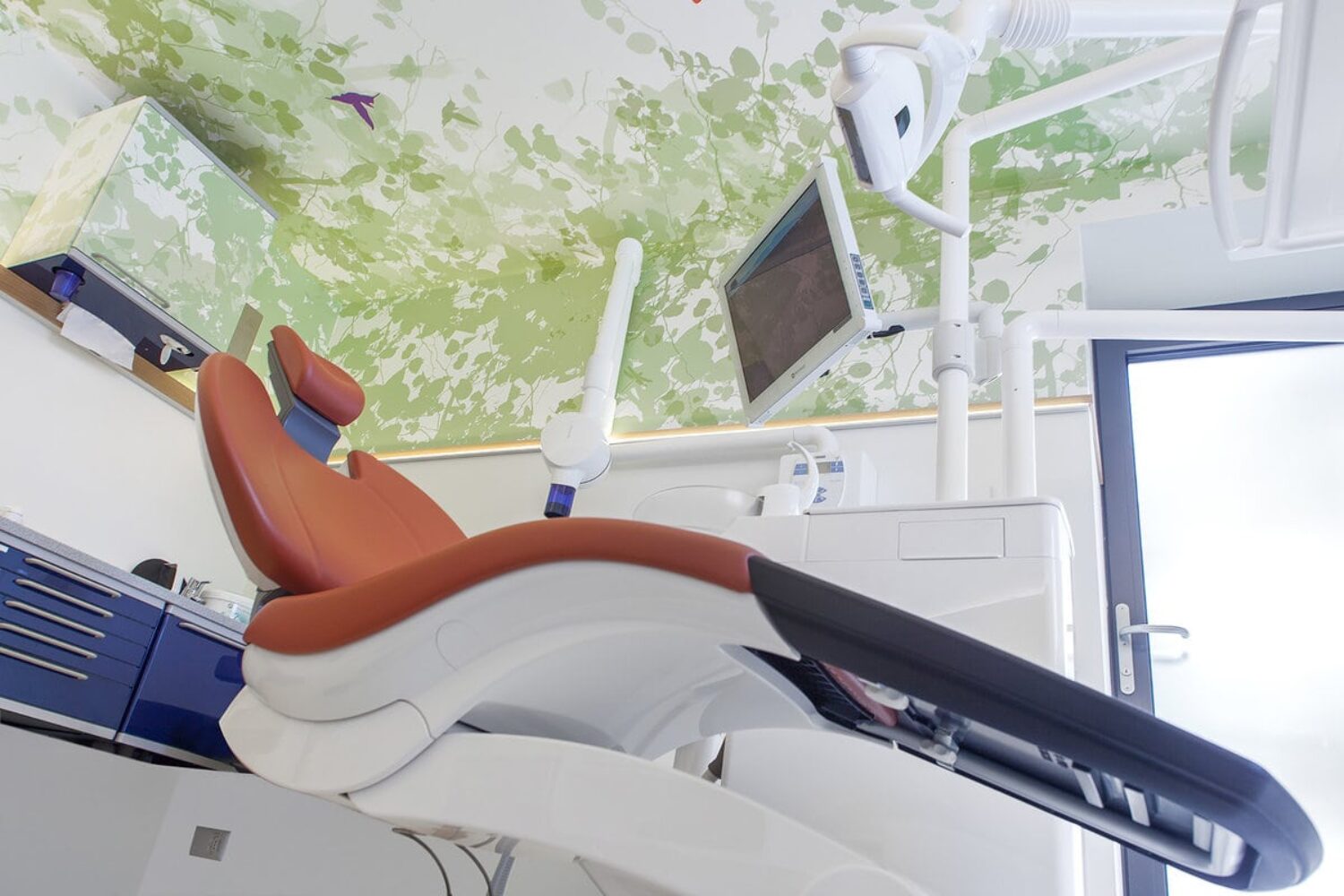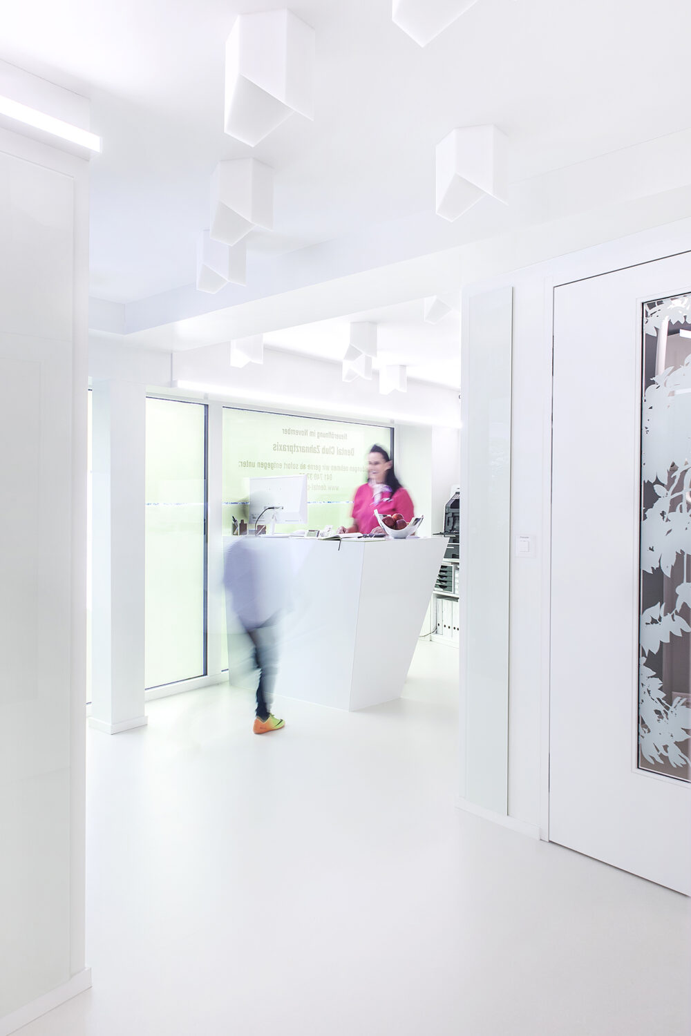 The “Dentalizer” as the central zone connecting all the rooms has a white reflective atmosphere and functions as a neutralising space of movement around which the various programmes and activities are arranged. The patient is welcomed here and moves on to the waiting area, which is decorated in warm tones. In the treatment rooms, the space is divided into two areas by introducing a visual horizon. While the lower part is assigned to the sterile, white working world of the dentist, the ceiling – which is the focus of the patient – acts as an atmospheric view into the crowns of a forest clearing.