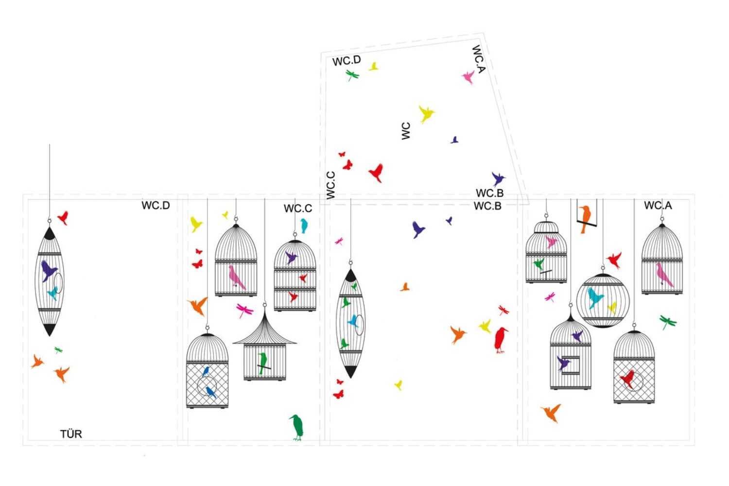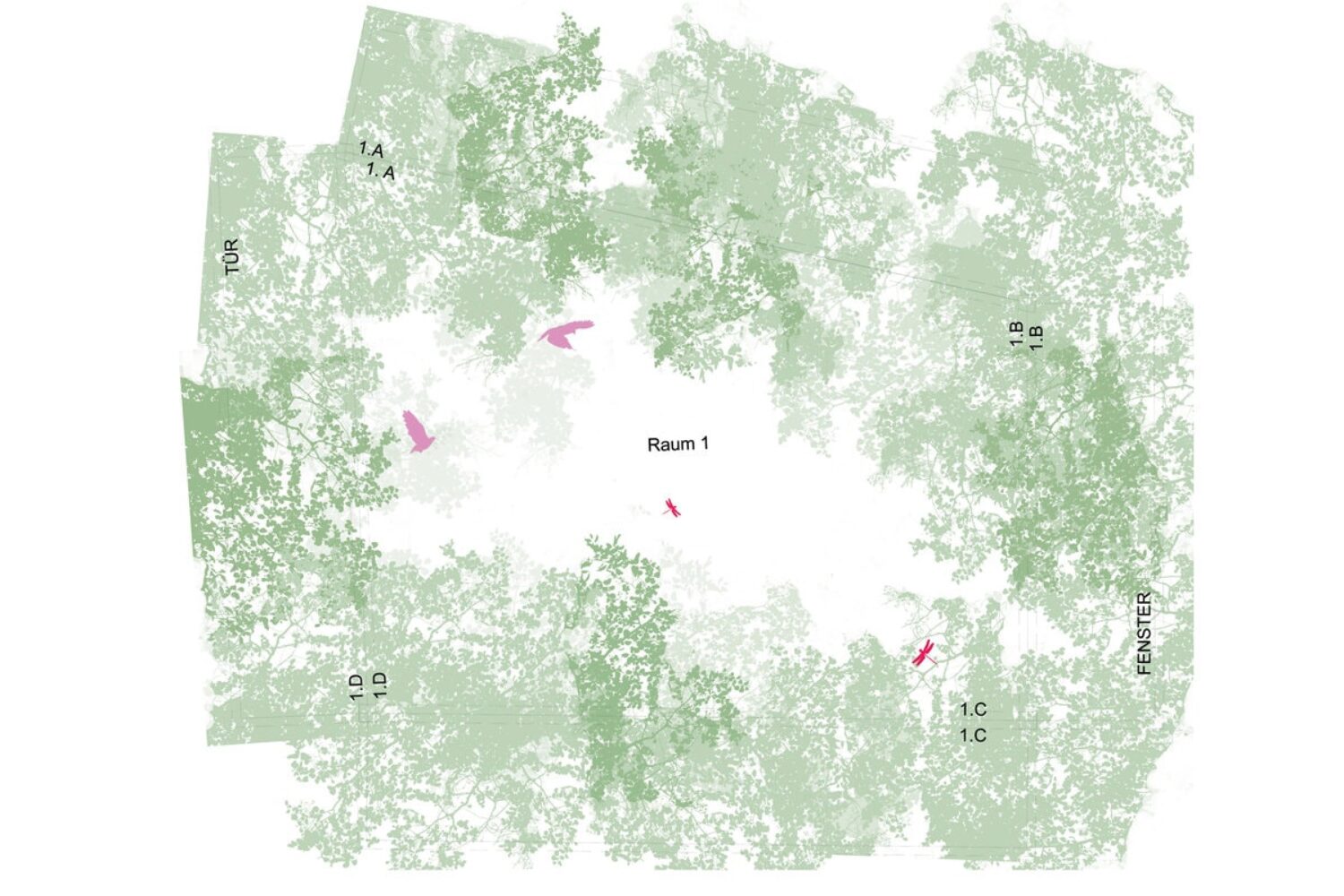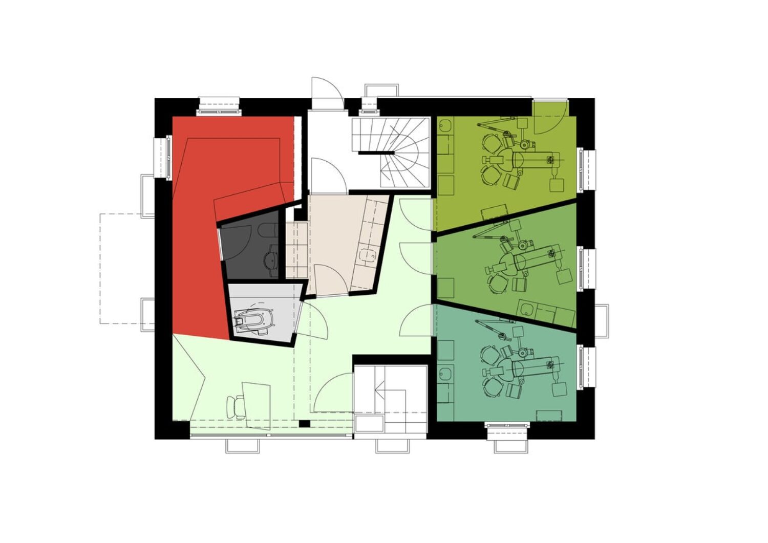 The “Dentalizer” as the central zone connecting all the rooms has a white reflective atmosphere and functions as a neutralising space of movement around which the various programmes and activities are arranged. The patient is welcomed here and moves on to the waiting area, which is decorated in warm tones. In the treatment rooms, the space is divided into two areas by introducing a visual horizon. While the lower part is assigned to the sterile, white working world of the dentist, the ceiling – which is the focus of the patient – acts as an atmospheric view into the crowns of a forest clearing.