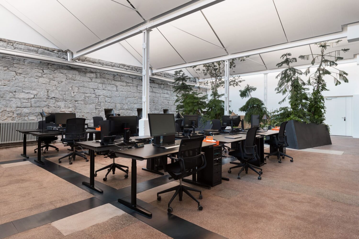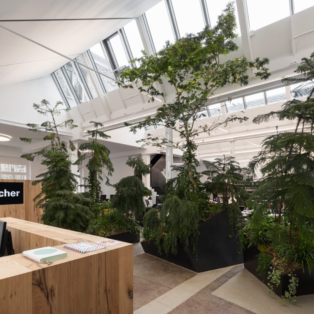 The actual heart of the design lies in the small office forest at the entrance. Anyone entering is surprised to find themselves in front of a green wall. A large variety of plants and overwhelmingly tall fir trees in huge steel troughs break the view into the space. The reception area also surprises – with its orientation into the space. The company’s values were translated into a unique spatial experience that, thanks to plants and natural surfaces, is also perceived as a healthy as well as stimulating work environment.