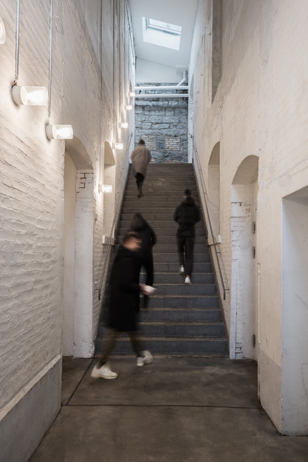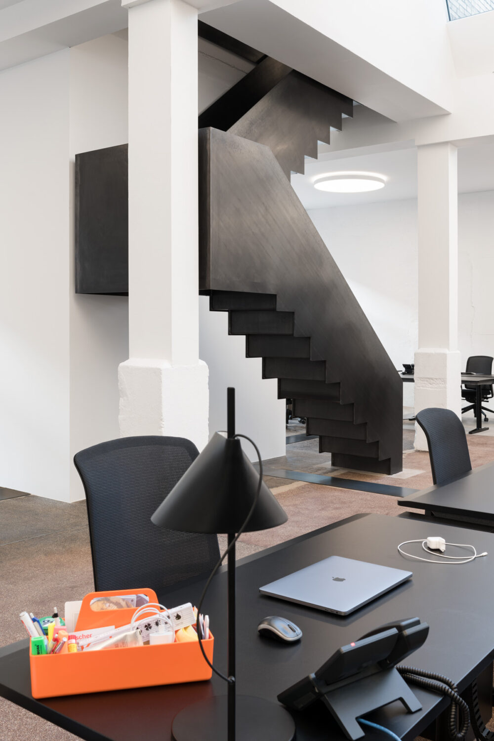 The result: a narrow internal steel staircase spatially binds the two floors together and enables the organizational separation between concentrated work in the hall and public uses on the upper floor. Acoustic panels, which are completely integrated into the structure of the Sched roof, provided an optimal solution to the challenging spatial acoustics in the hall’s open space.