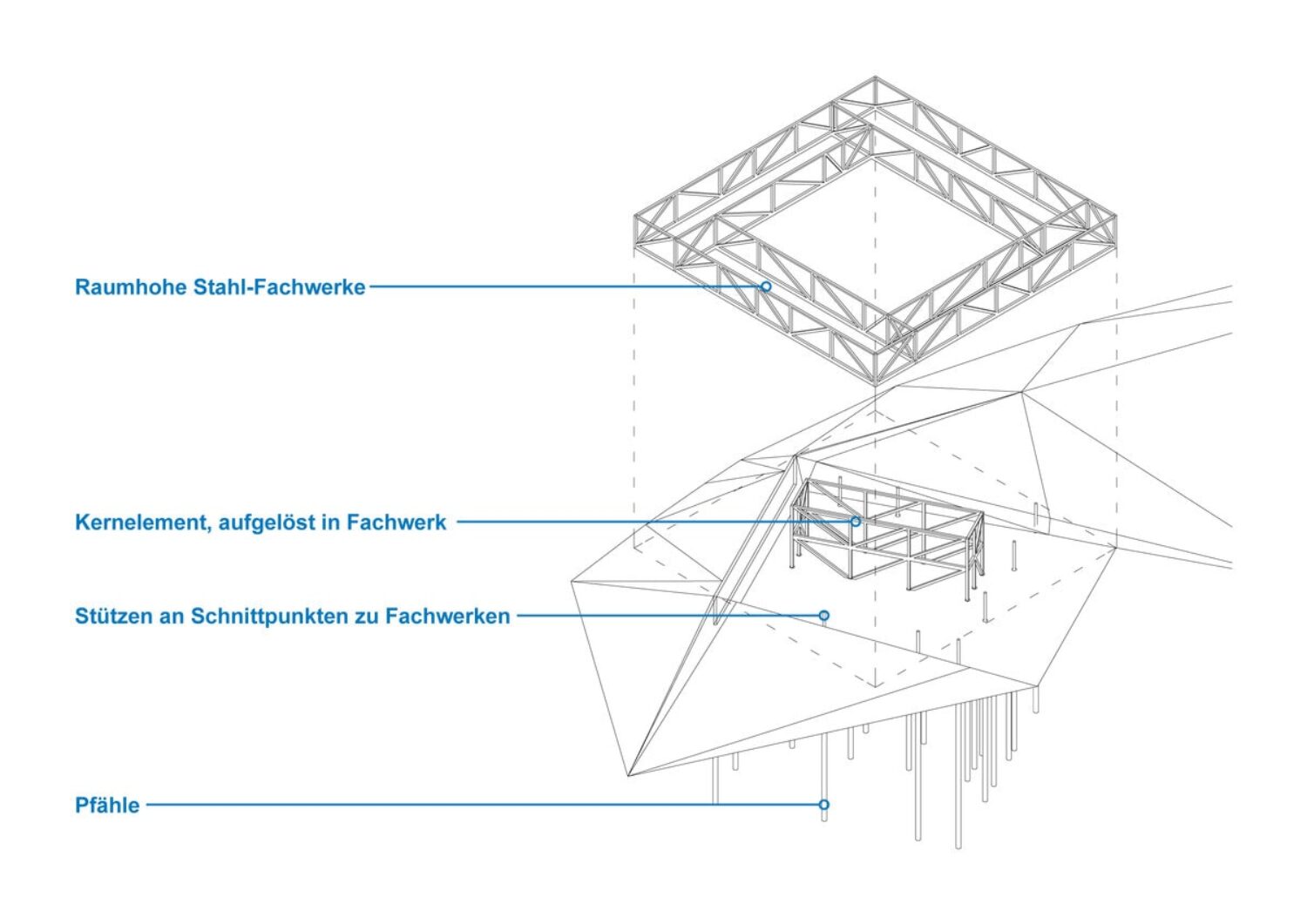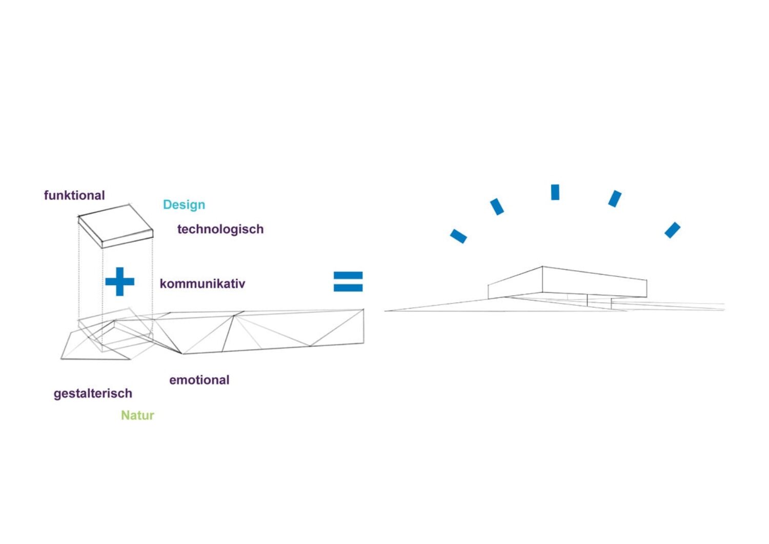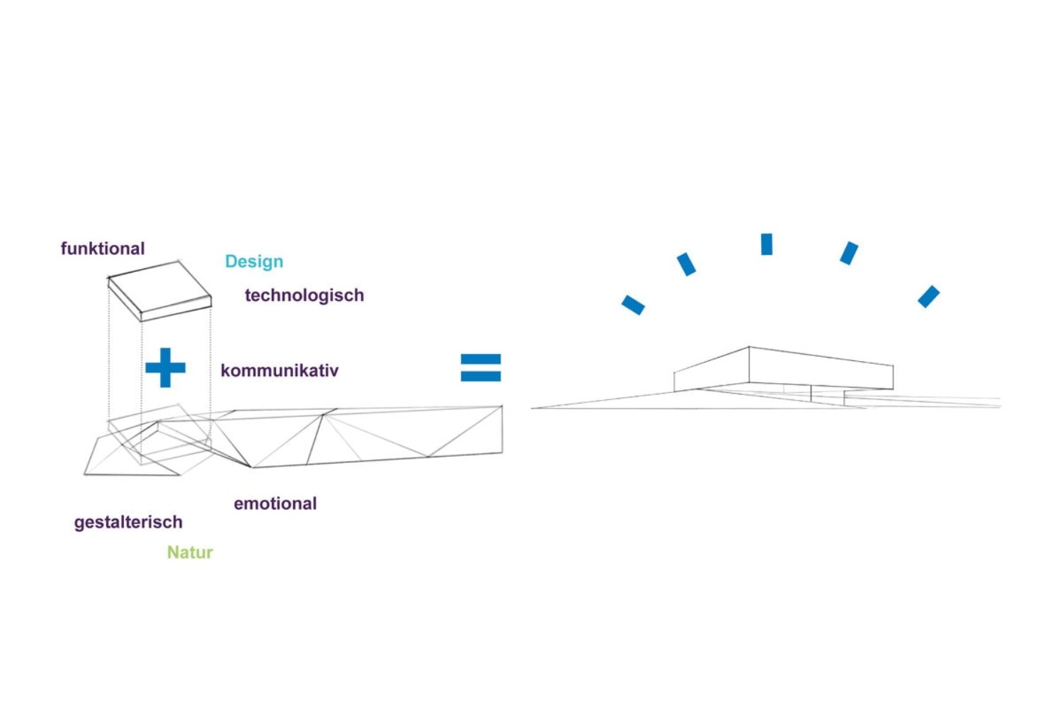 The precise siting of the new building achieves both optimal visibility to the public and a direct spatial connection to the existing factory site. The emblematic building forms the welcome gesture for visitors and local residents. The shimmering white box only becomes a sign through its elevated position on the former embankment. In keeping with the architectural design, the structural concept follows a clear formal language.