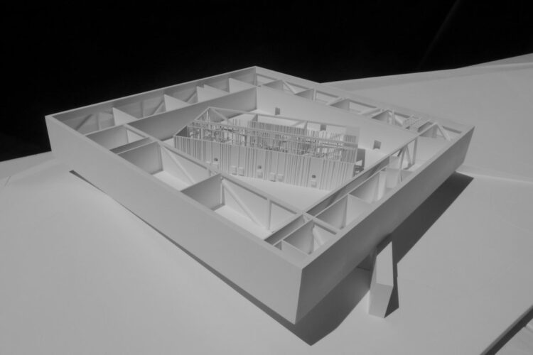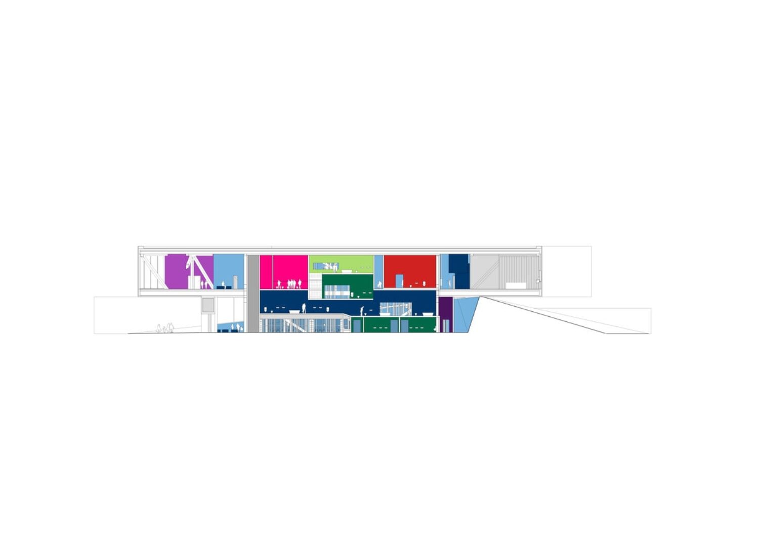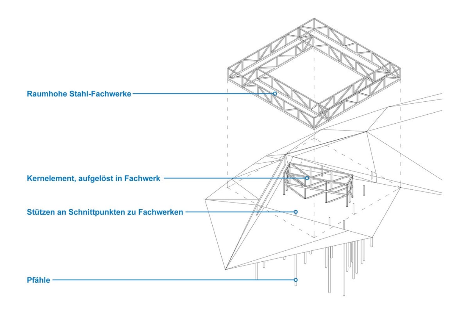 The precise siting of the new building achieves both optimal visibility to the public and a direct spatial connection to the existing factory site. The emblematic building forms the welcome gesture for visitors and local residents. The shimmering white box only becomes a sign through its elevated position on the former embankment. In keeping with the architectural design, the structural concept follows a clear formal language.