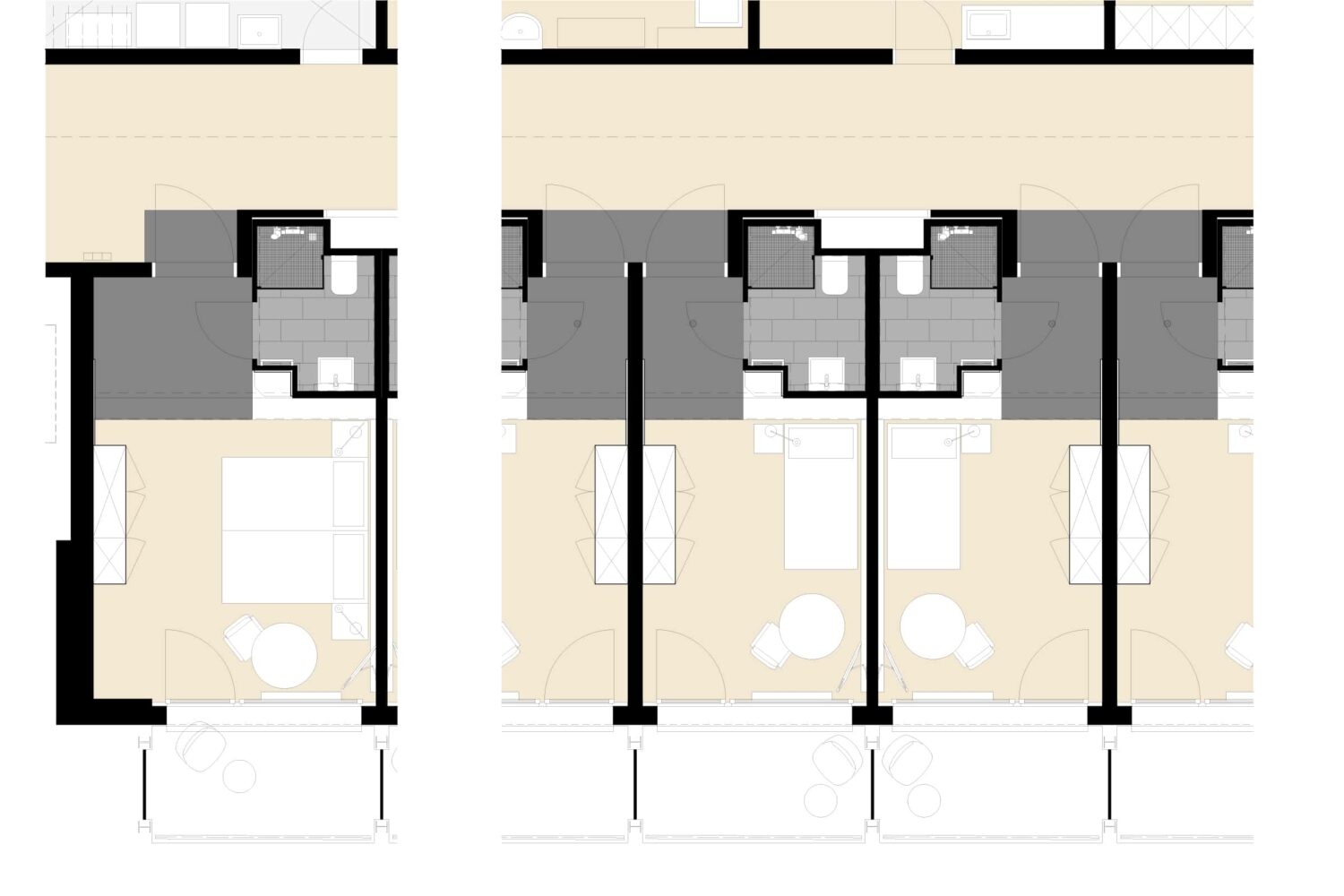 The new, more spacious room types of the extension fit into the concept of “first-class rehab hospitality”, while the lower floors were developed to a lower standard. Private, semi-private and general rooms thus cover the needs and demands of the target groups of the Hochgebirgsklinik Davos.