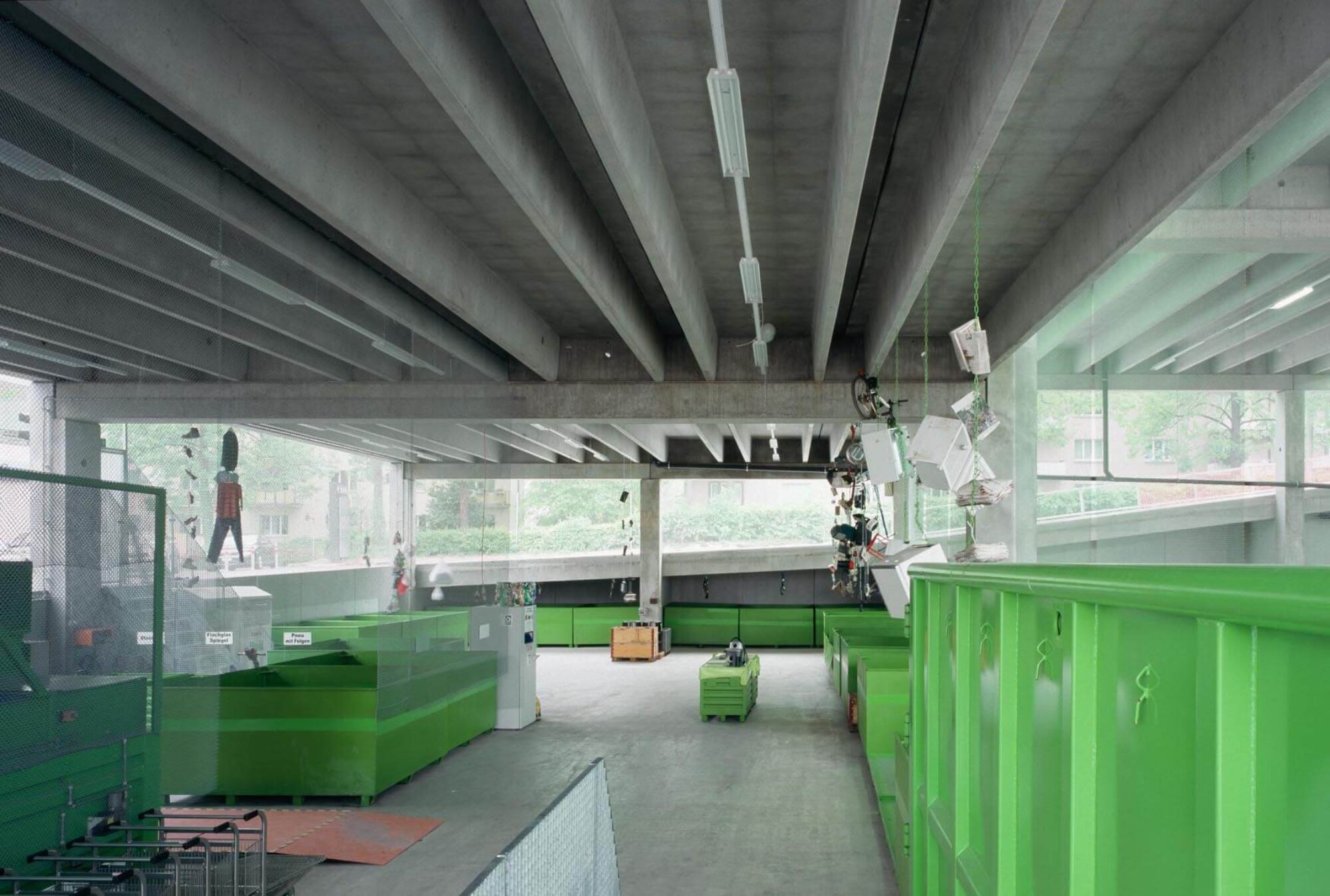 The Maag recycling centre turns waste disposal into a tangible experience. Customers buy back their waste. First, they load their shopping trolleys with scrap, drive them to the recycling centre, where they follow a route to deposit their waste in the various green collection boxes.