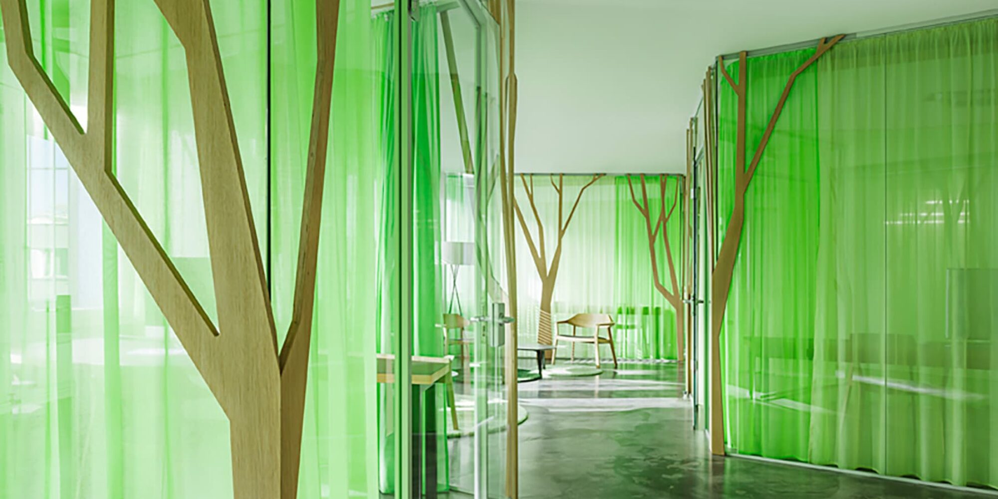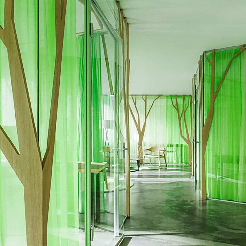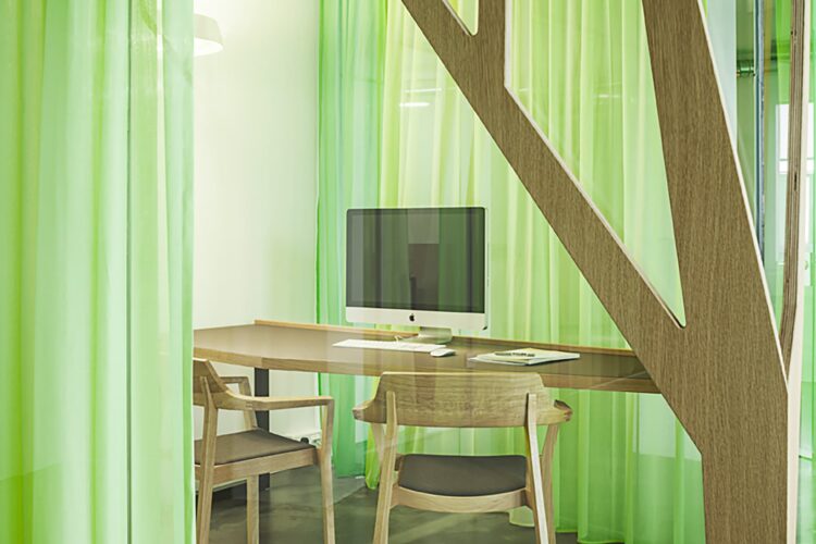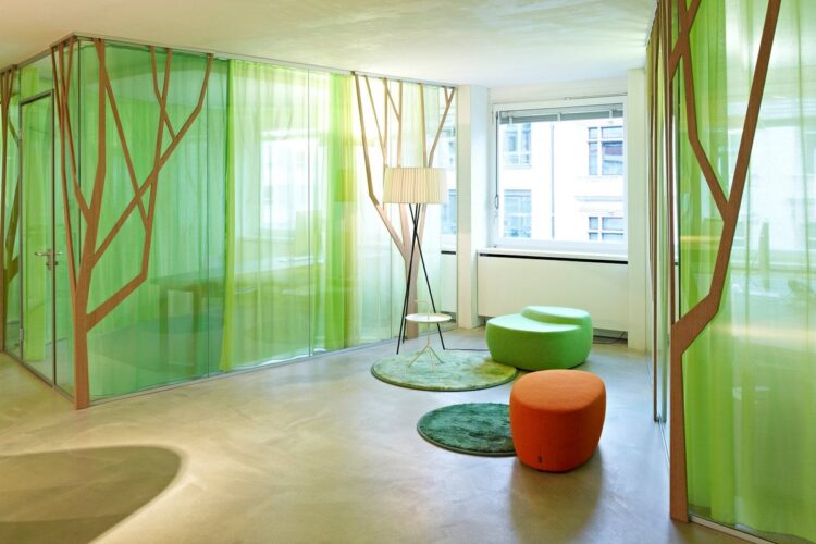 The cabins are covered with tree structures that create atmosphere and provide the necessary privacy with the curtain panels. The acoustic tarpaulins and carpets in the booths form a space within a space and a different acoustic situation; subdued, trusting, discreet. Further international locations are already being considered.