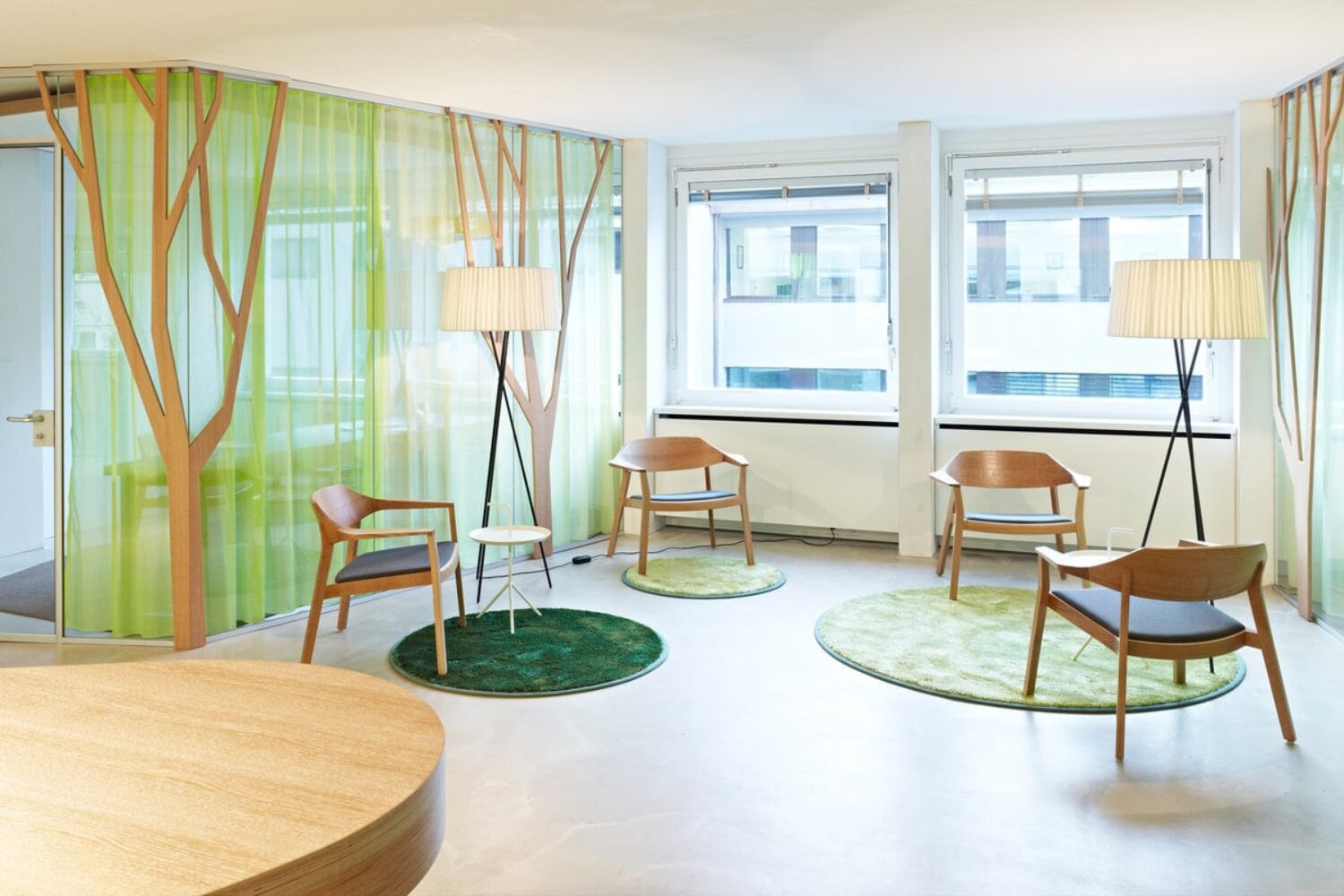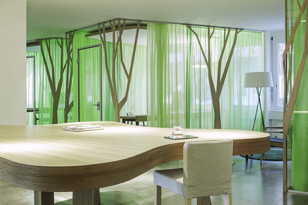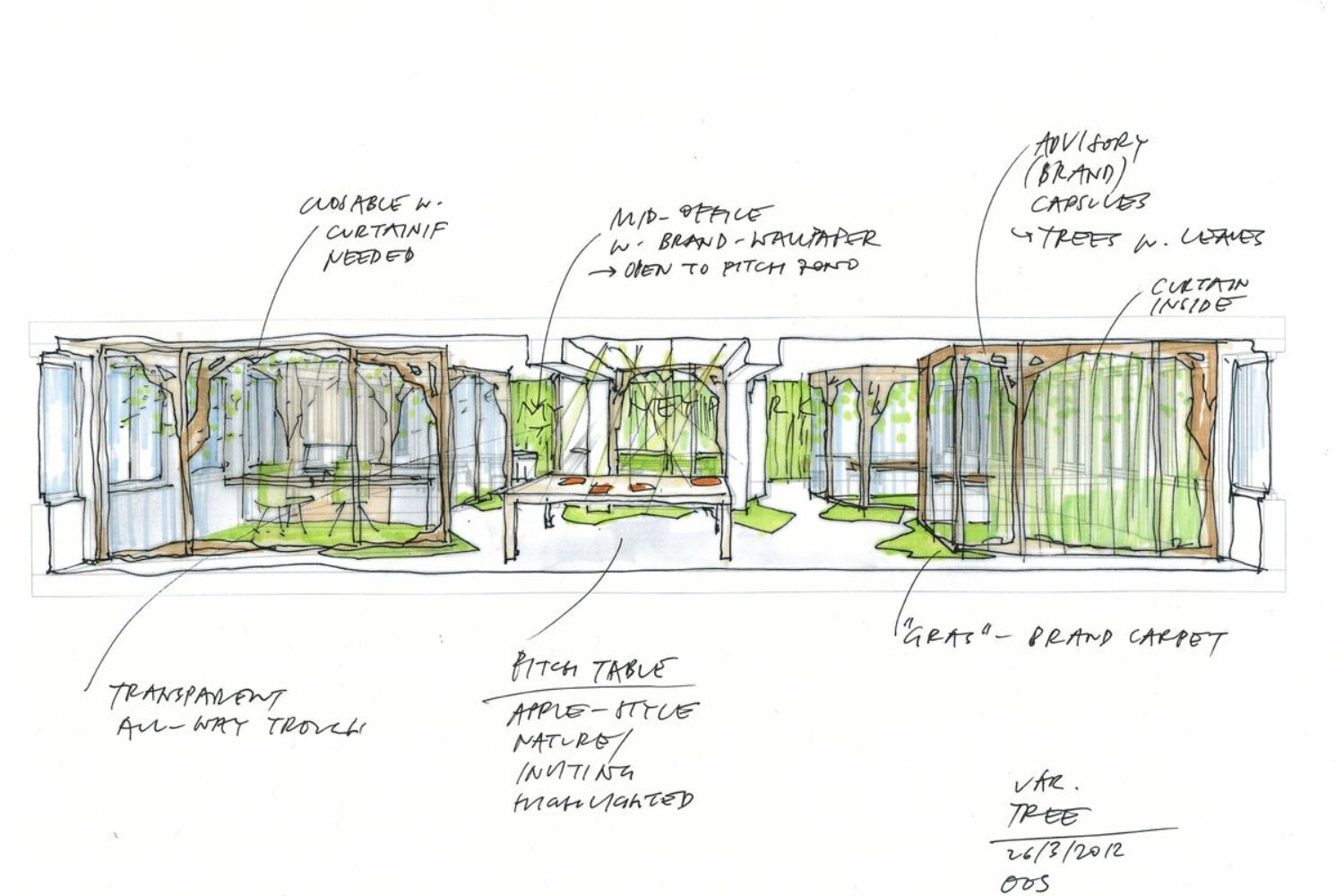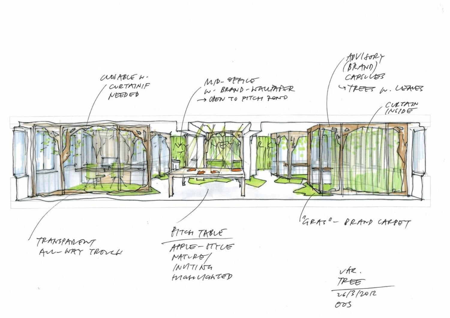 In the entrance area, the client is guided to a pitch table where he or she can find out about investment opportunities. The personal advisory appointments take place in one of the eight “tree houses”.