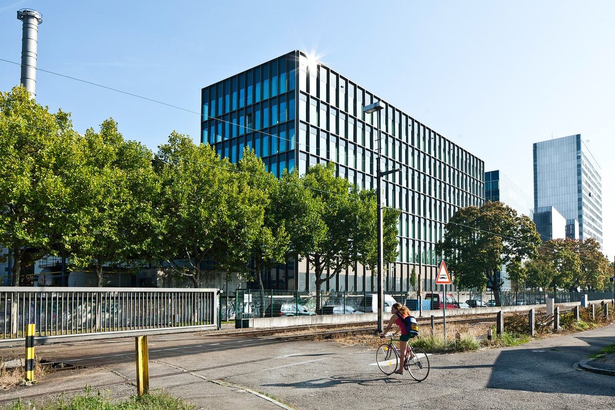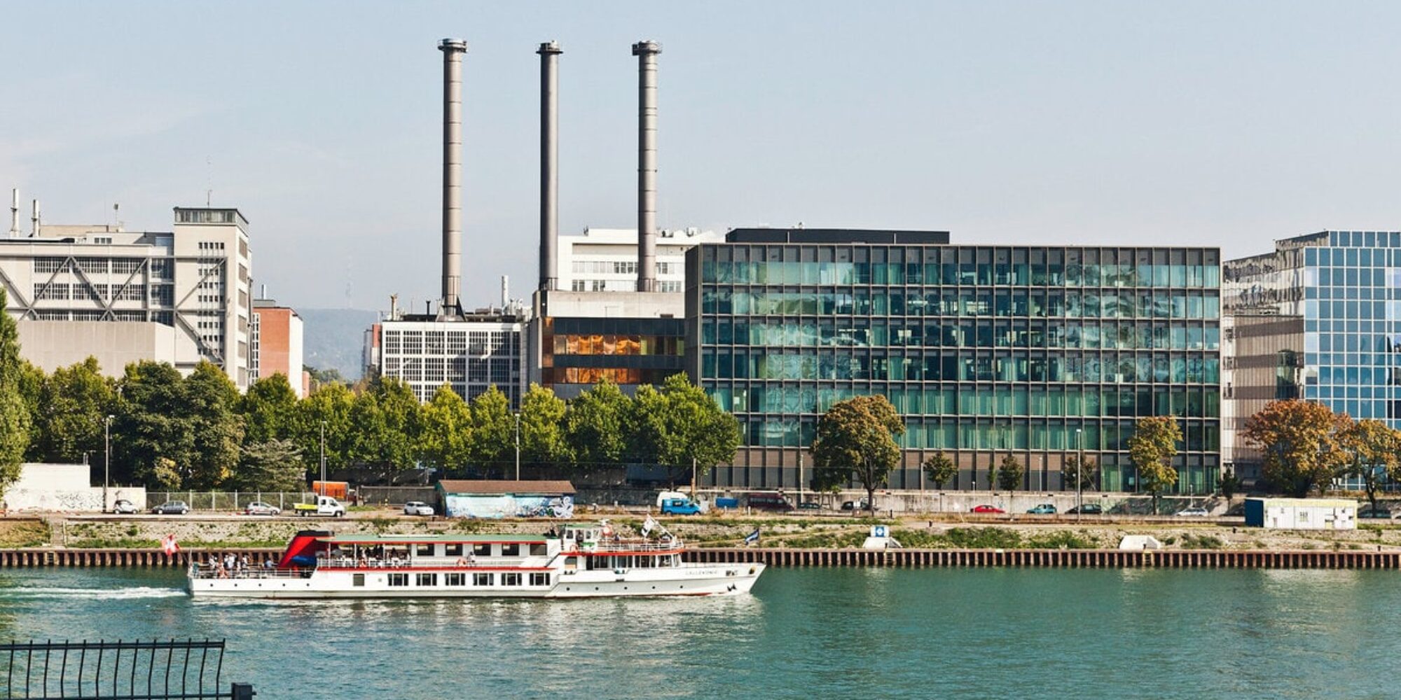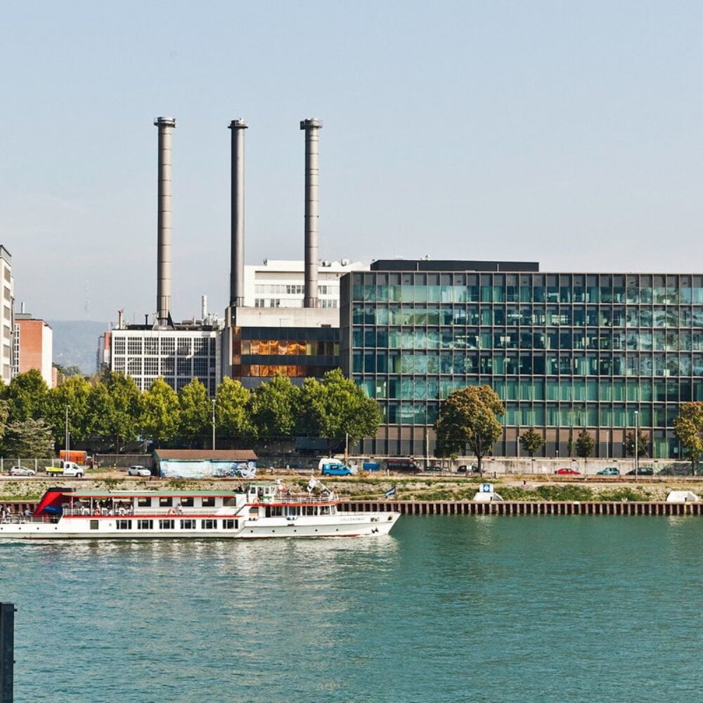 The Office and Service Centre planned and implemented by OOS at the Klybeck Plant in Basel is located directly on the Rhine River and provides a wonderful view of the river and the Novartis Campus on the other side through its glass facade.