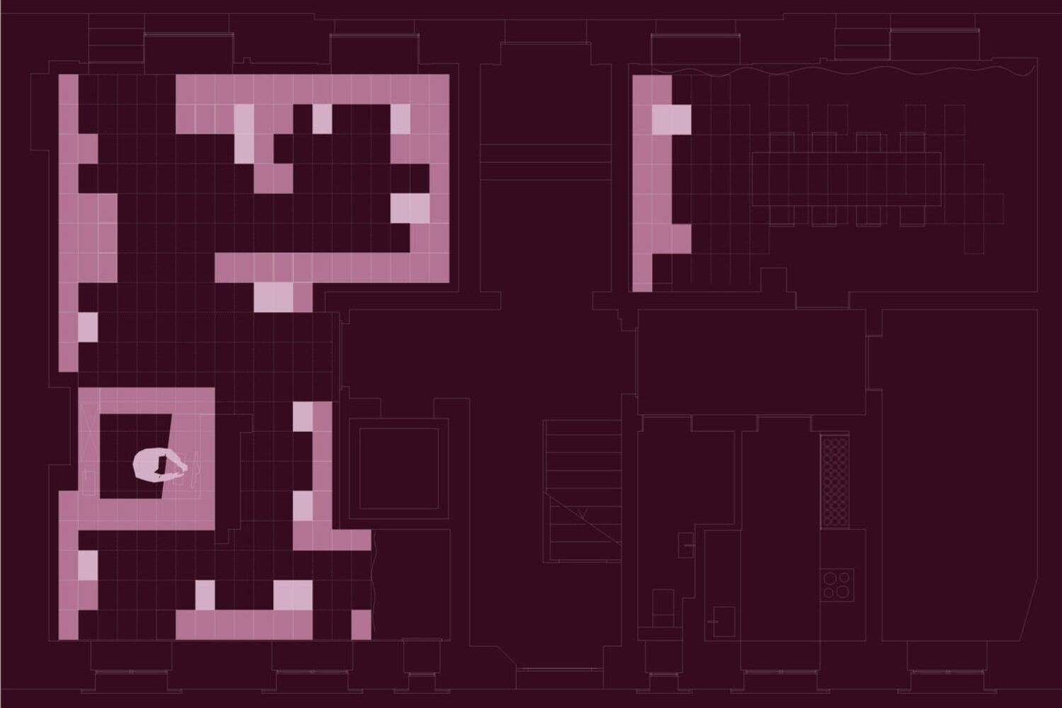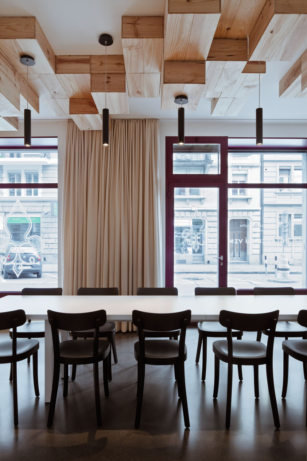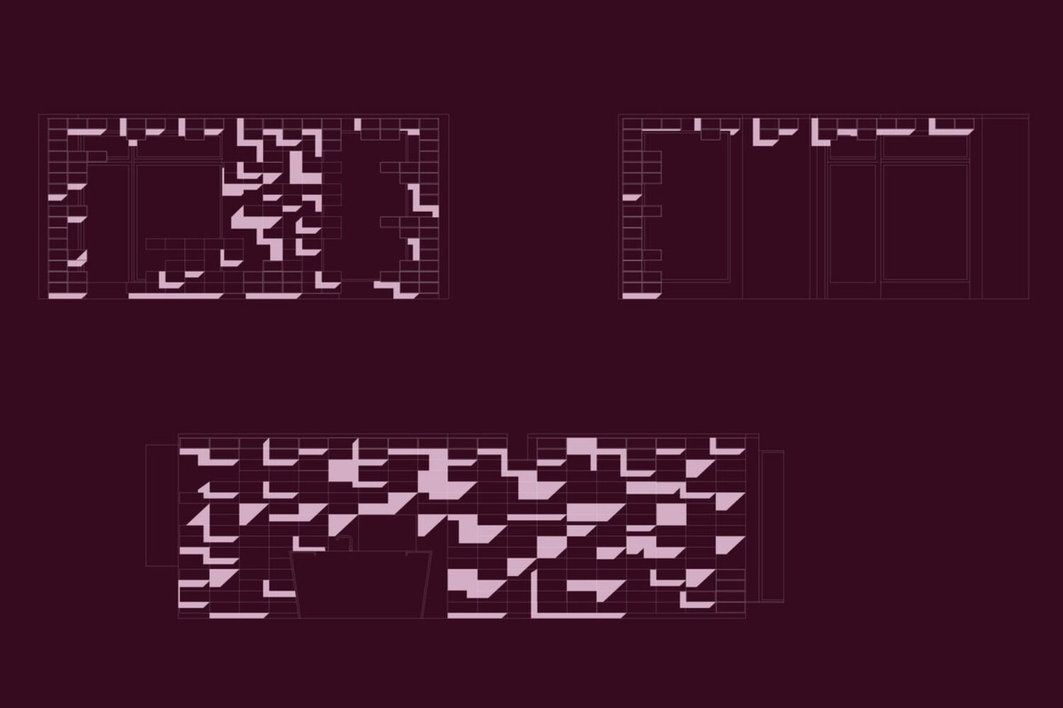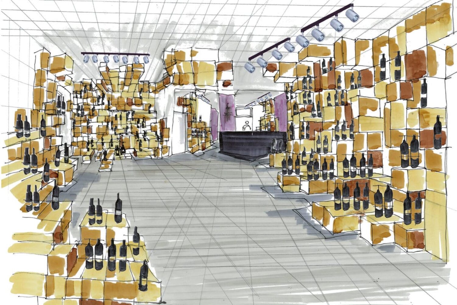 Arranged in a grid, they serve as a platform for around 570 wines, illuminated table showcases as well as books and seats. In the middle of the room, the reception is situated as a counter, equipped for wine purchase advice and with its violet/ruby tone contrasting with the wood of the wine crates. The lights on the ceiling are formally oriented to the wine bottles and integrate into the presentation of the wine bottles.