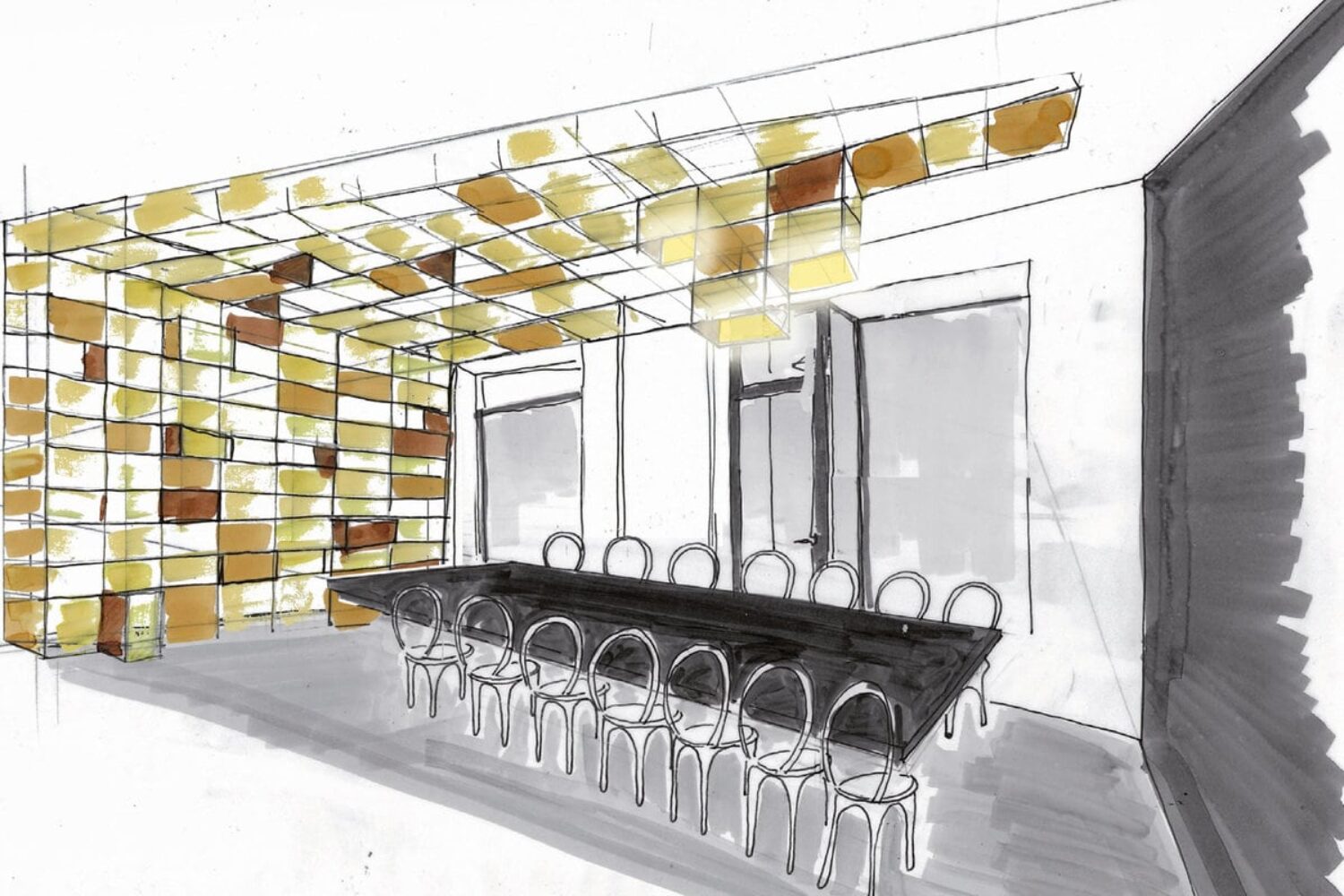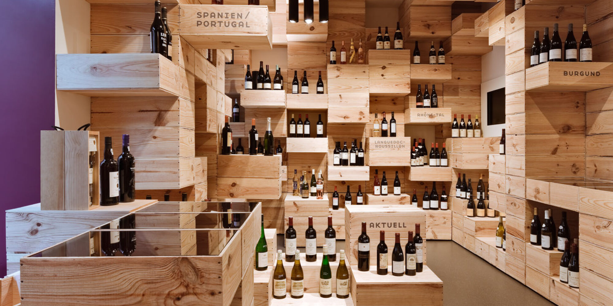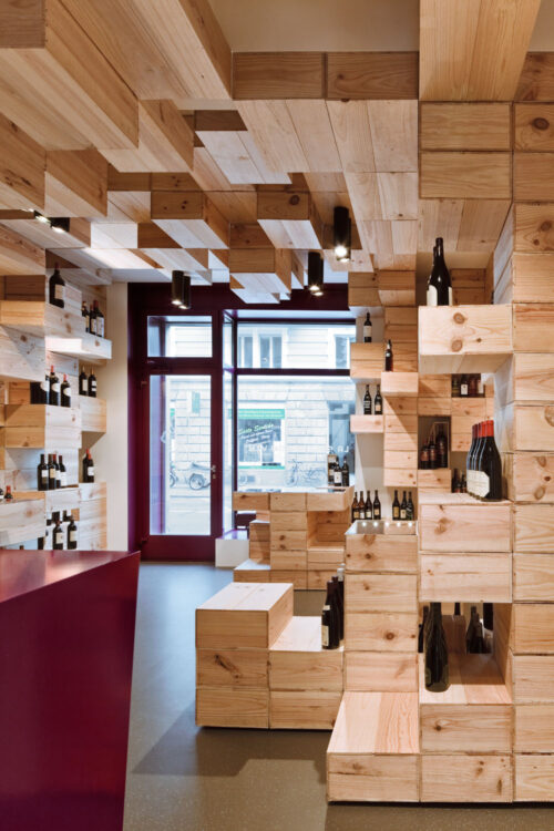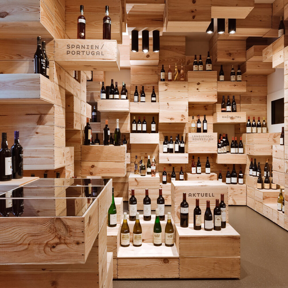 The interior design aims to create a strong image of a landscape made up of wine crates, in which the quality wines are presented like in a Schaulager with their crates. Around 1,500 unbranded wine crates from the Bordeaux region cover the entire room up to the ceiling and form a grotto-like environment.