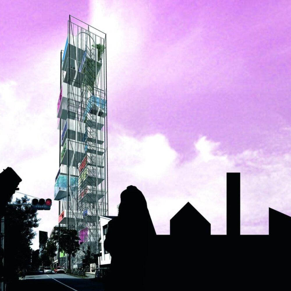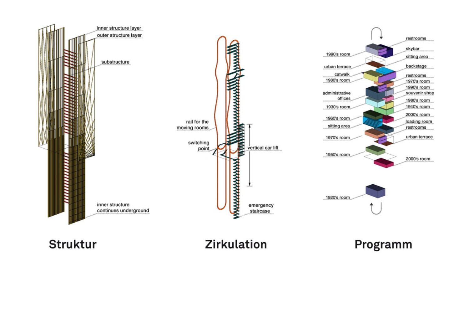 The Tokyo Fashion History Museum is a kinetic building consisting of 21 movable exhibition boxes. During the “museum trip” the museum visitor can walk through the differently staged exhibition boxes, enjoy the view of the city and observe the passing scenes of visitors and exhibits.