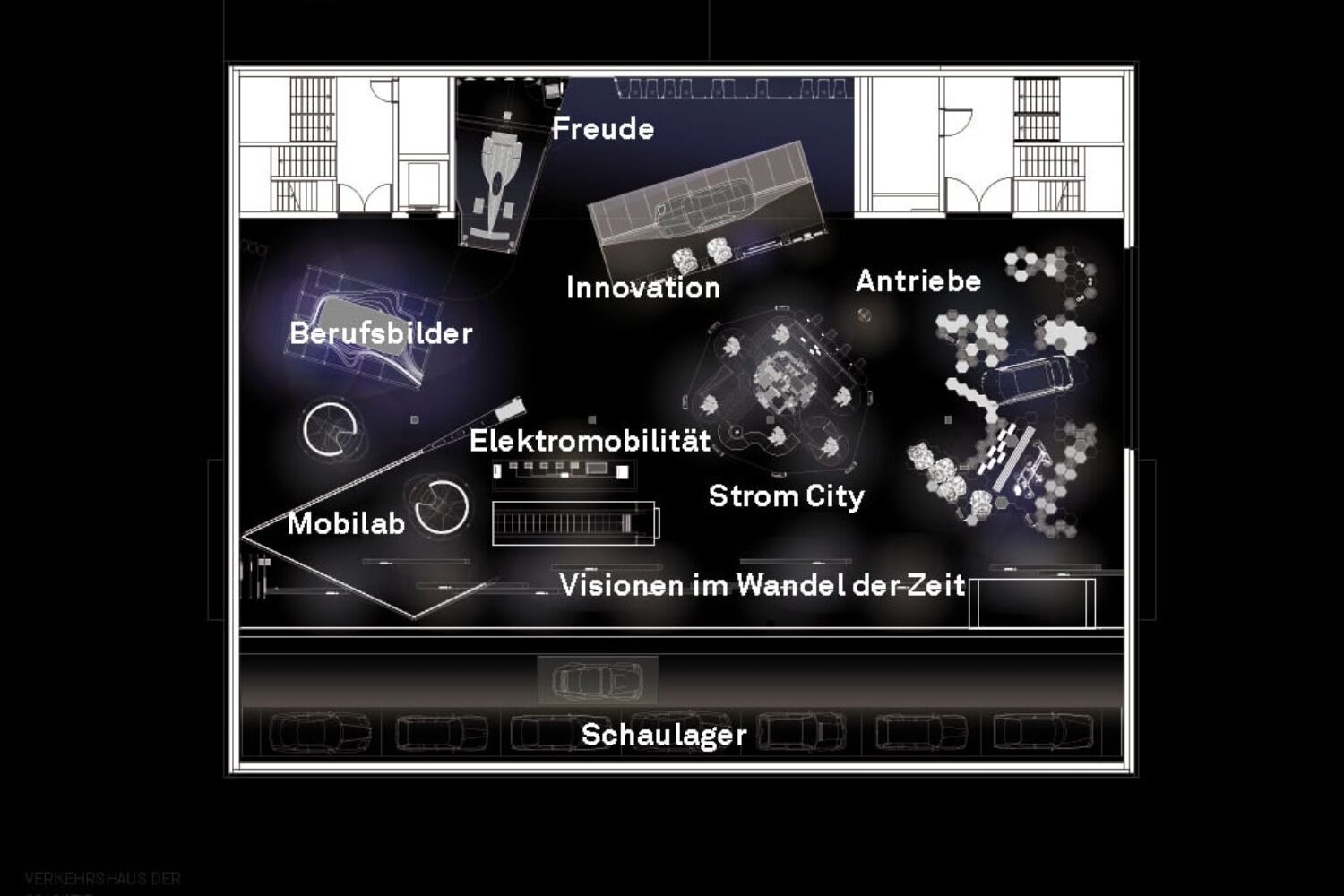The individual exhibition themes are translated into design metaphors and are recognisable in spatially insular, individually designed exhibition buildings. Different experience offers and the spatial overlays take into account both the cultural interests of the Swiss Museum of Transport and the commercial interests of the sponsors and financing partners.