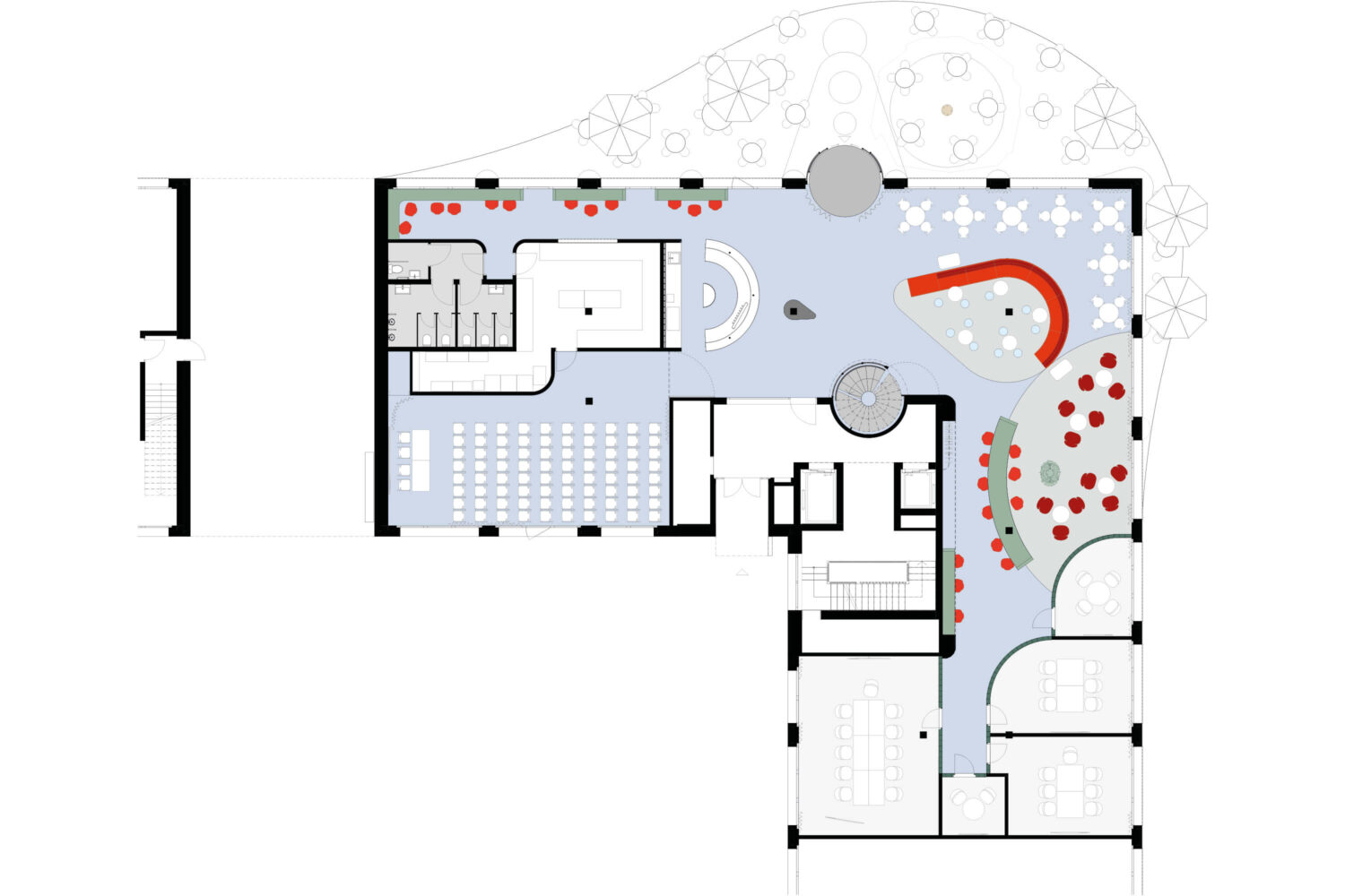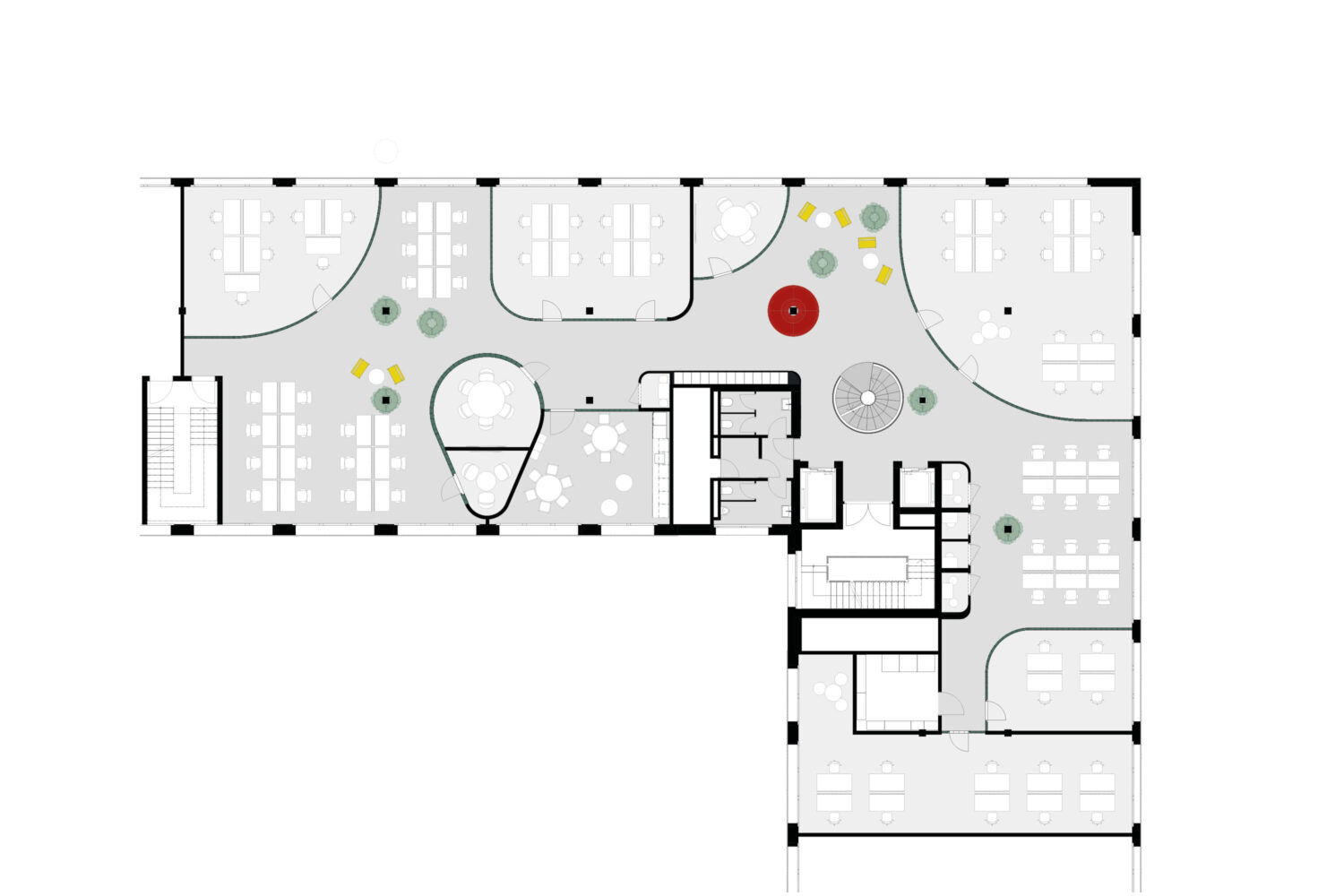 A new entrance area, a café/restaurant and event and workshop rooms have been created on the ground floor. The catering area offers tenants and external guests catering throughout the day and will become a bar in the evening.