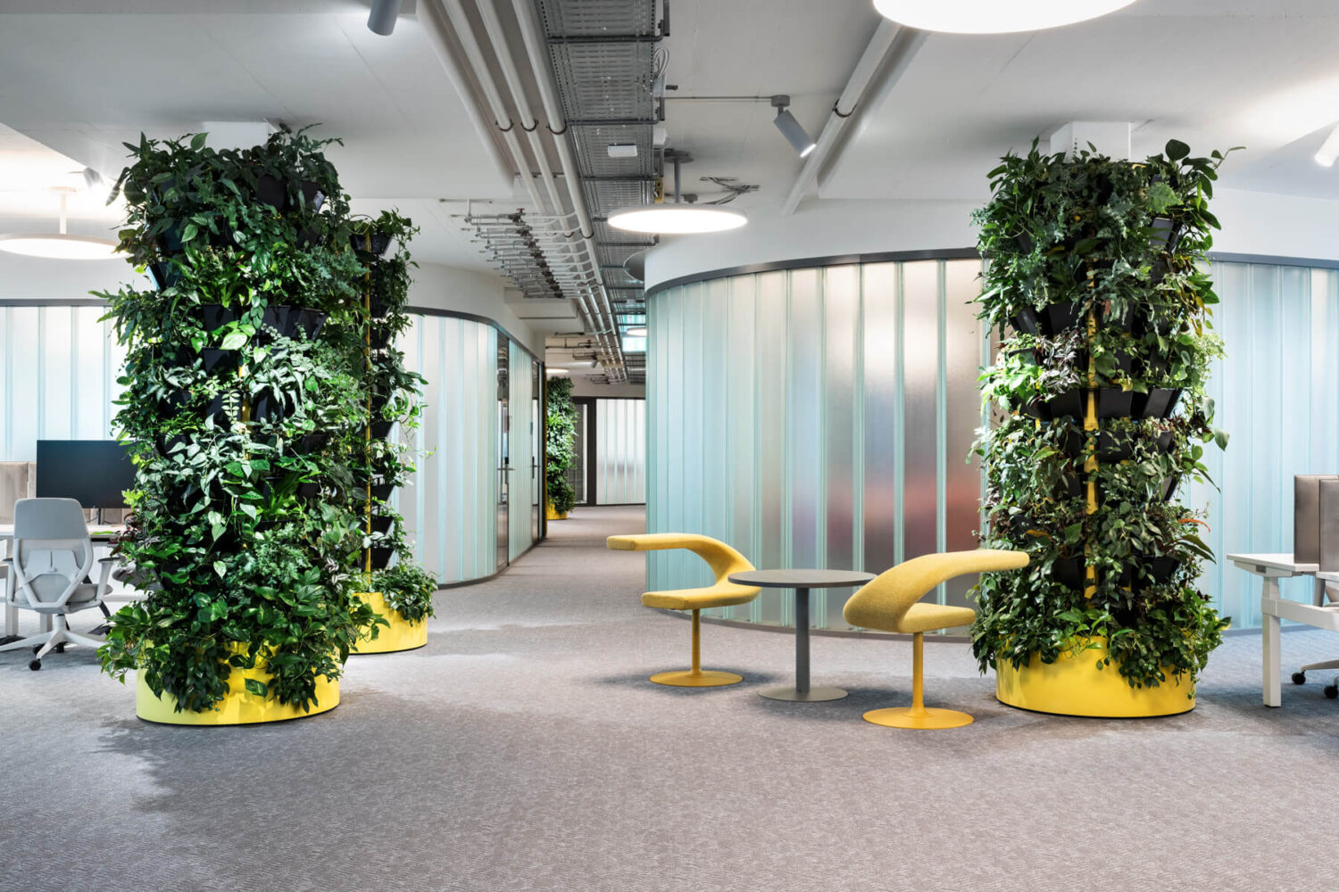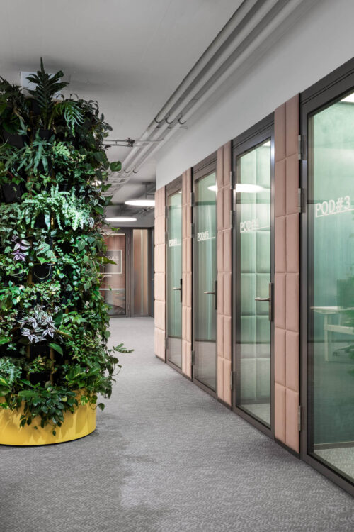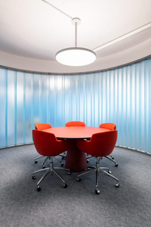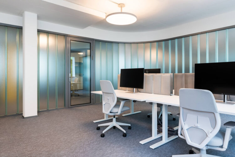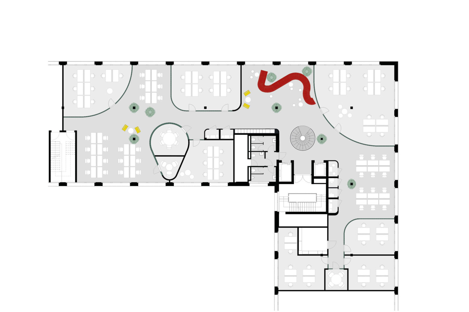 The flexible offices and meeting rooms are located on the two upper floors. These are formed in a circle like orbits, which are connected by flowing spaces in between. The available space ranges from individual workstations to larger work areas with a plug & play principle, which promotes the productivity and well-being of users through the indoor climate and acoustics.