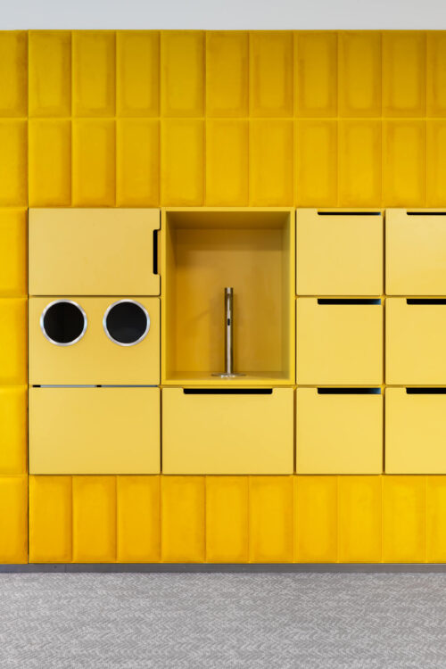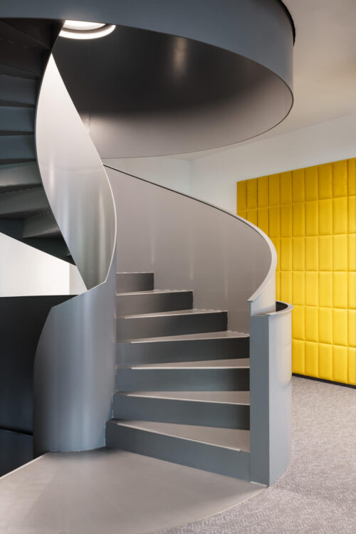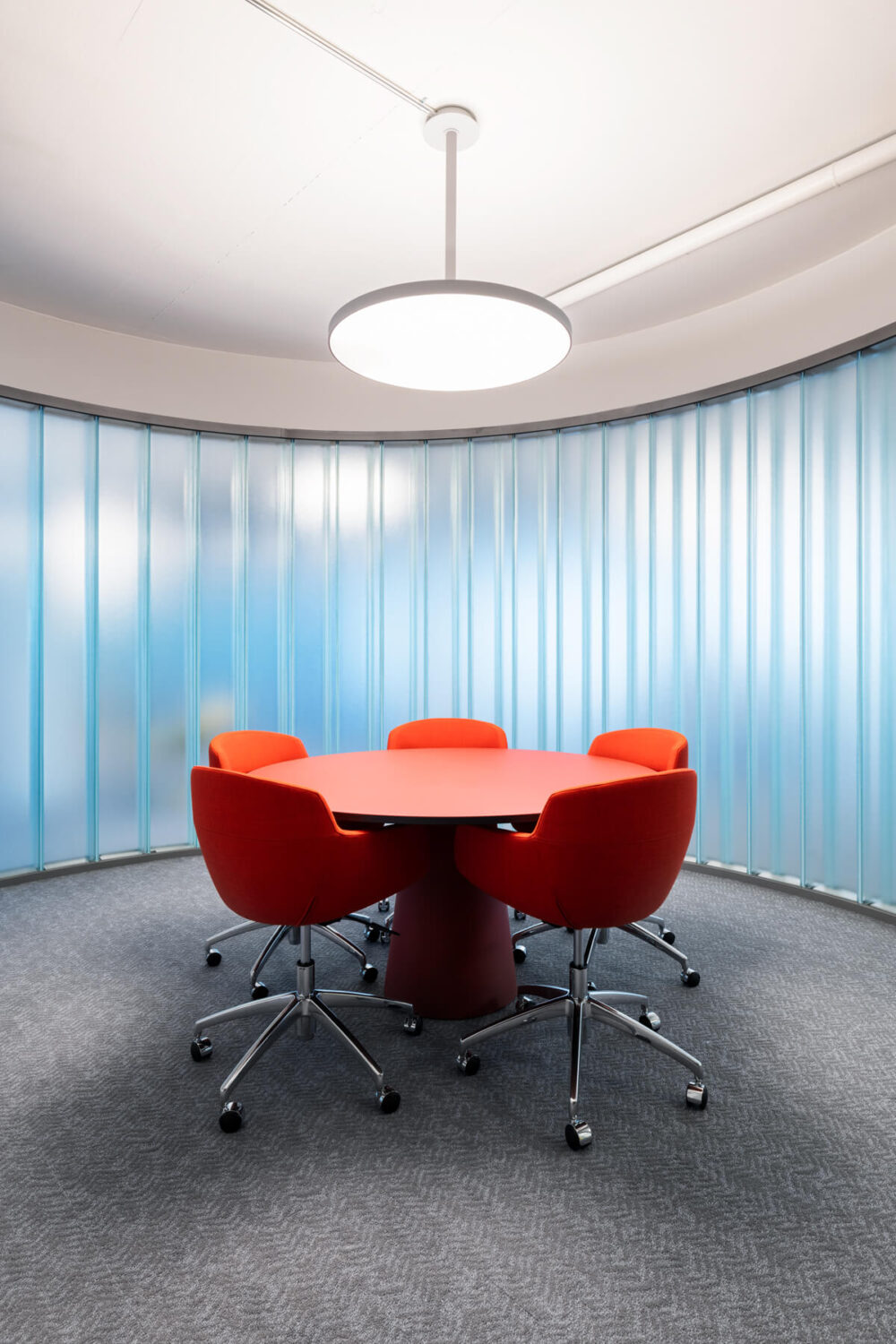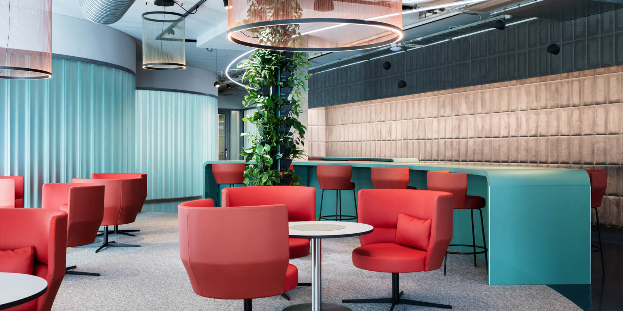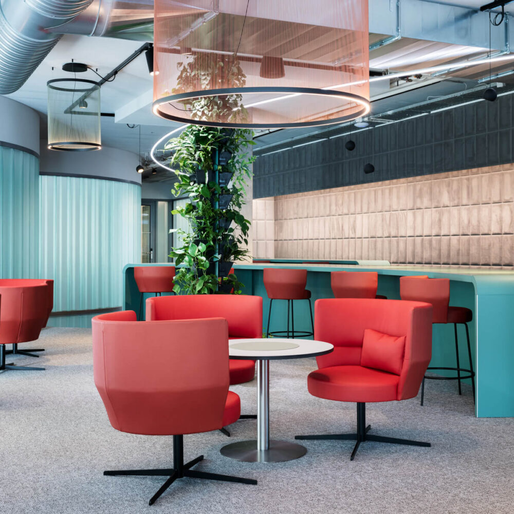 The commission from Pensimo Management is an example of the remodeling of existing buildings. The new interior design is also intended to strengthen the ORBIZ brand and give it a unique identity. An open and flowing spatial structure was the brief. The design is based on the look of science fiction films from the 70s.