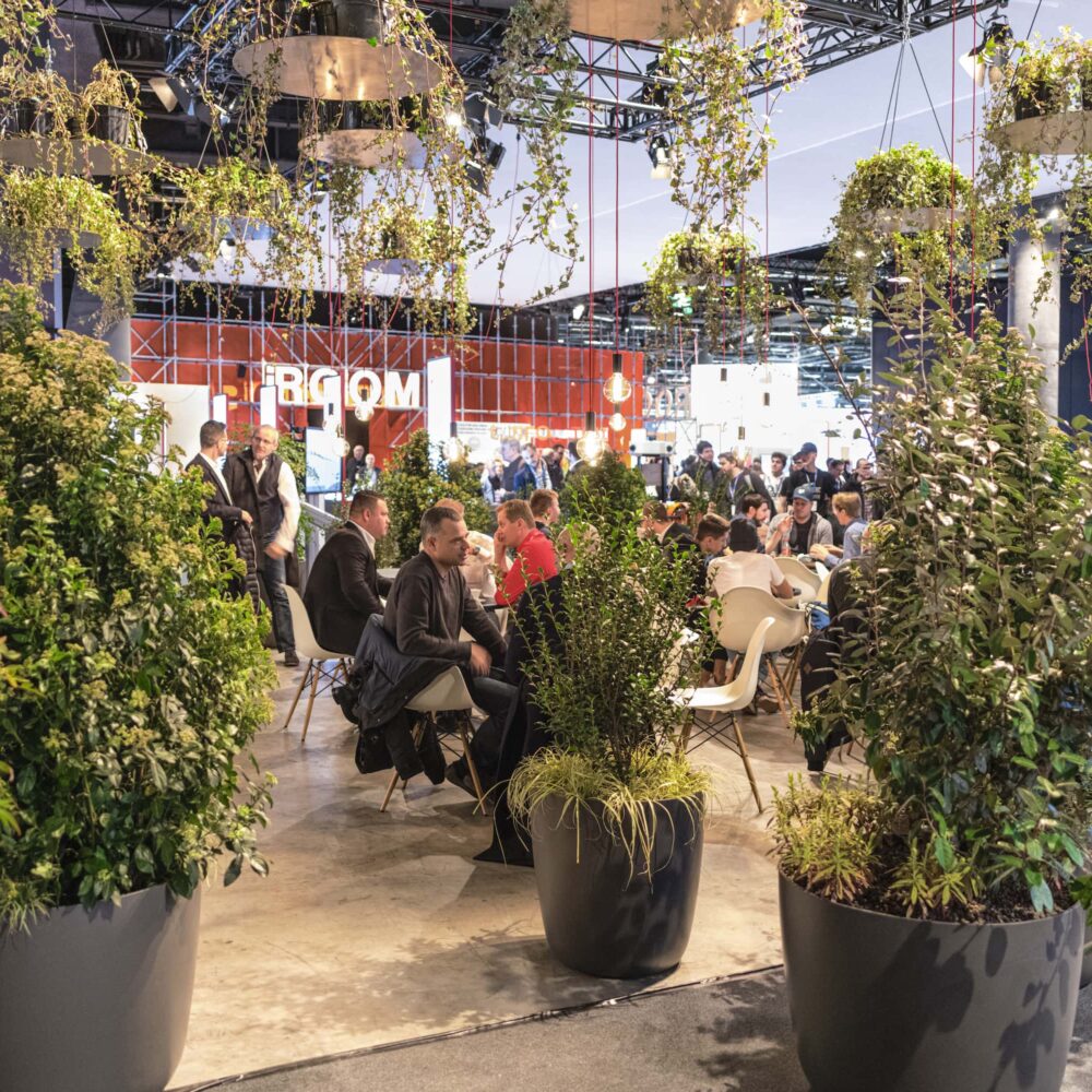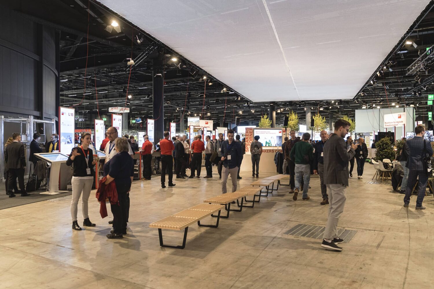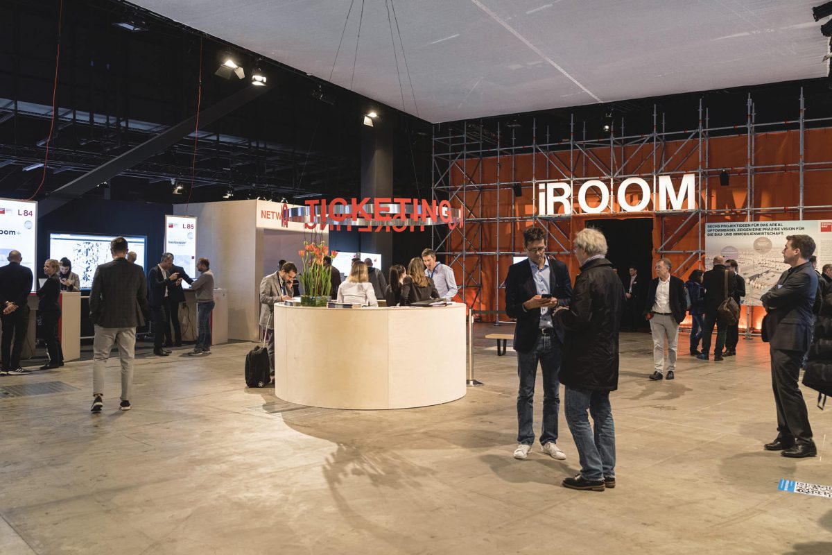 The area was divided along the contents: An “Innovation Village”, a “Networking Zone”, a “Speakers Corner” and the highlight of the special show and central element of the architectural staging, the “iRoom”. It is a state-of-the-art experience space for digital planning. Here, the innovation projects were staged as a 3D cinema in an interactive show. A real atmospheric contrast was created by a bistro designed as a green oasis with real plants.