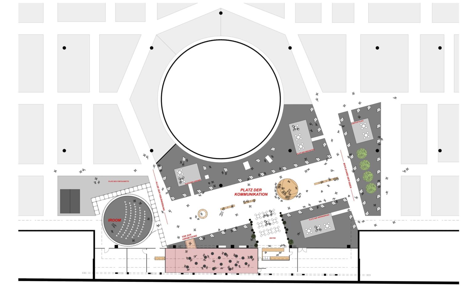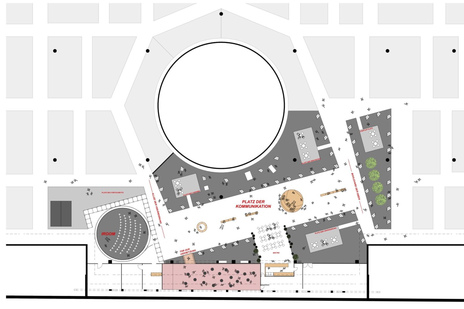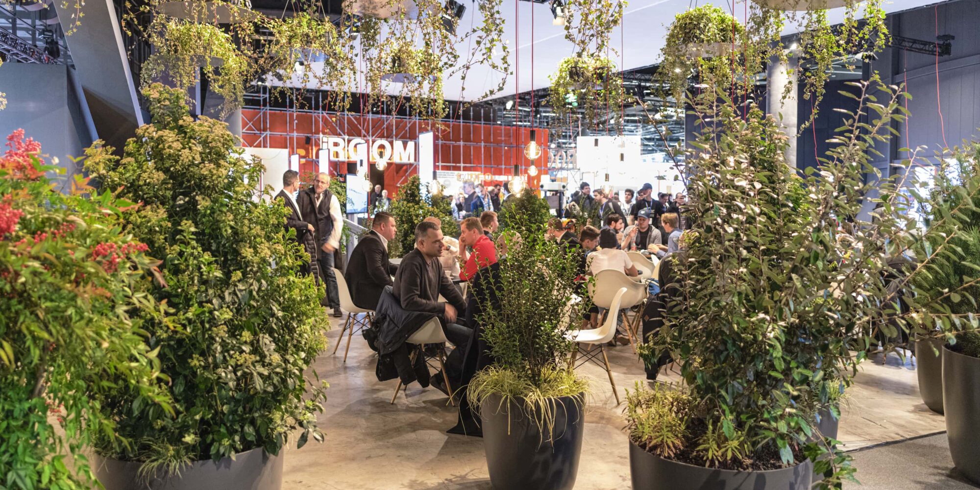 The area was divided along the contents: An “Innovation Village”, a “Networking Zone”, a “Speakers Corner” and the highlight of the special show and central element of the architectural staging, the “iRoom”. It is a state-of-the-art experience space for digital planning. Here, the innovation projects were staged as a 3D cinema in an interactive show. A real atmospheric contrast was created by a bistro designed as a green oasis with real plants.