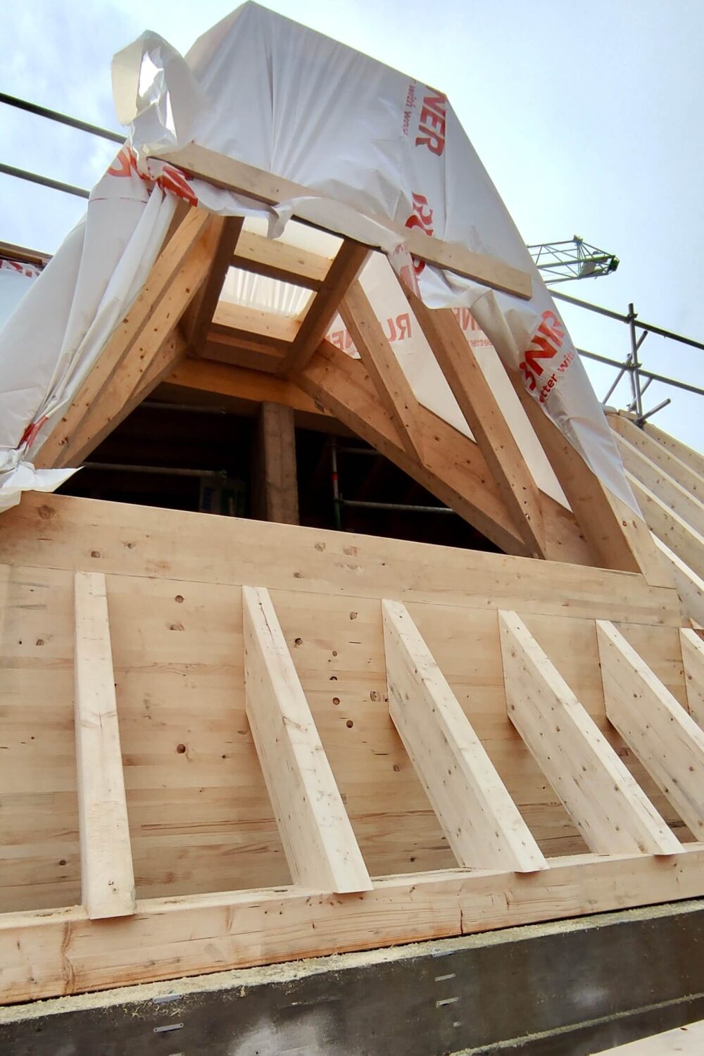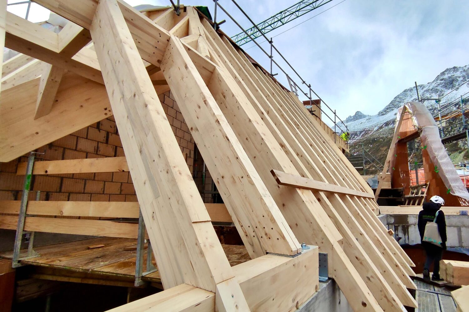Haus Val Val, the latest and third project for Andermatt Swiss Alps AG, is taking shape. Despite the winter-proof covering in the pictures, the special architecture can already be surmised. The top floor impresses with its complex geometry and is an exciting structural challenge.