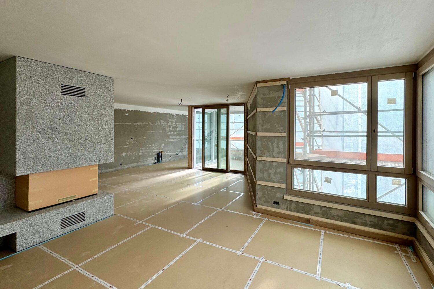 The penthouses on the top floor in duplex design, with skylights and two-storey windows, create an impressive height. The roof structure will remain visible on the inside. Generous windows and loggias, which serve as conservatories, offer breathtaking views. Another picture shows the view from the living room into the dining area, the kitchen and the loggia as well as the fireplace.