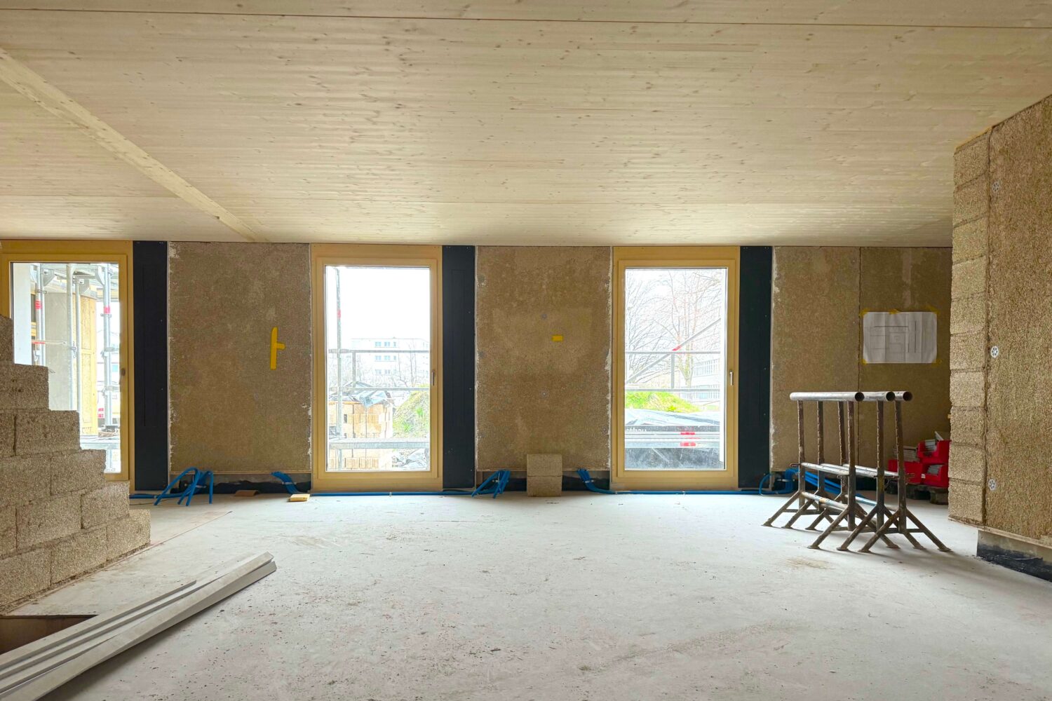 Exterior walls made of hempcrete with wooden studs for the statics and lime plaster, interior walls made of hemp bricks and lightweight walls with clay building boards, biochar concrete and cork insulation boards for the stairwell and underground car park. Every detail was designed to maximise sustainability. An inspiring project, we think!